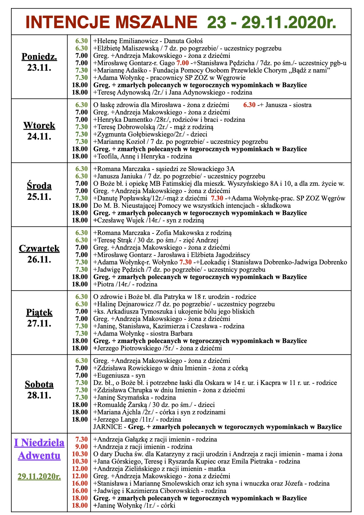 INTENCJE MSZALNE 23 – 29.11.2020r.