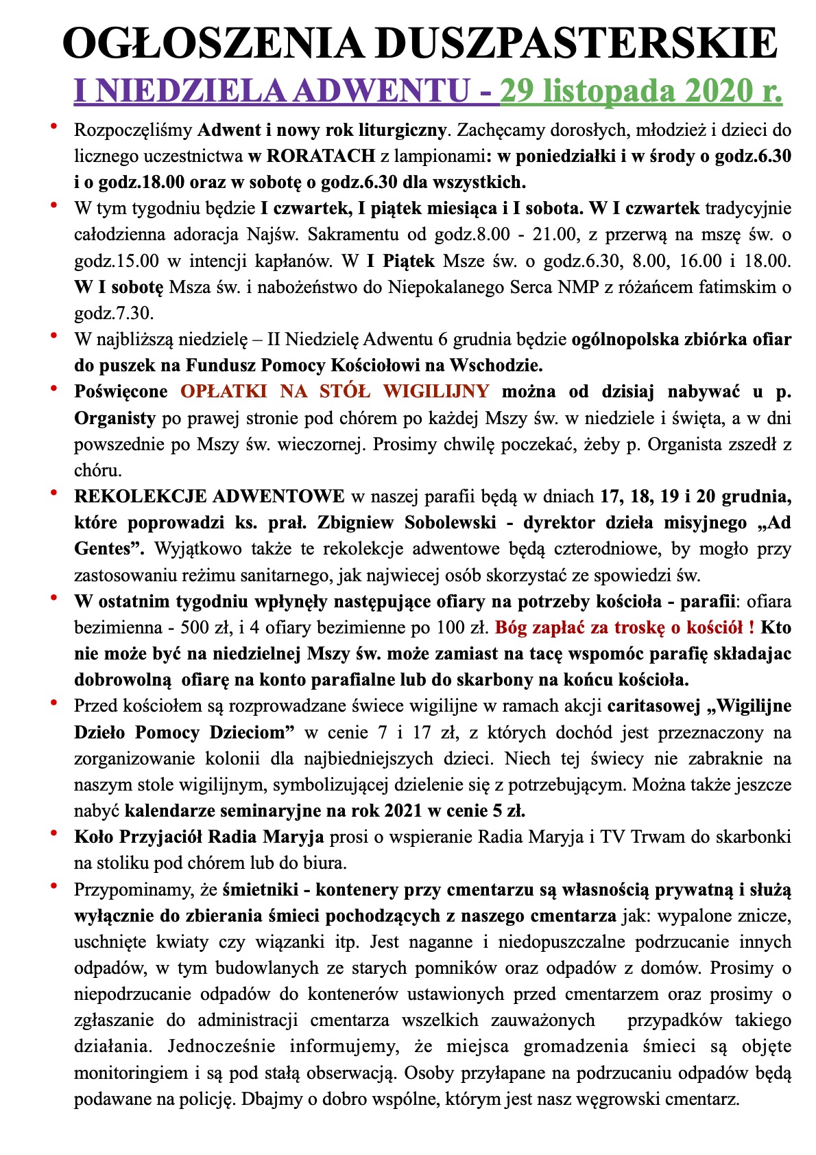 I NIEDZIELA ADWENTU – 29 listopada 2020 r.