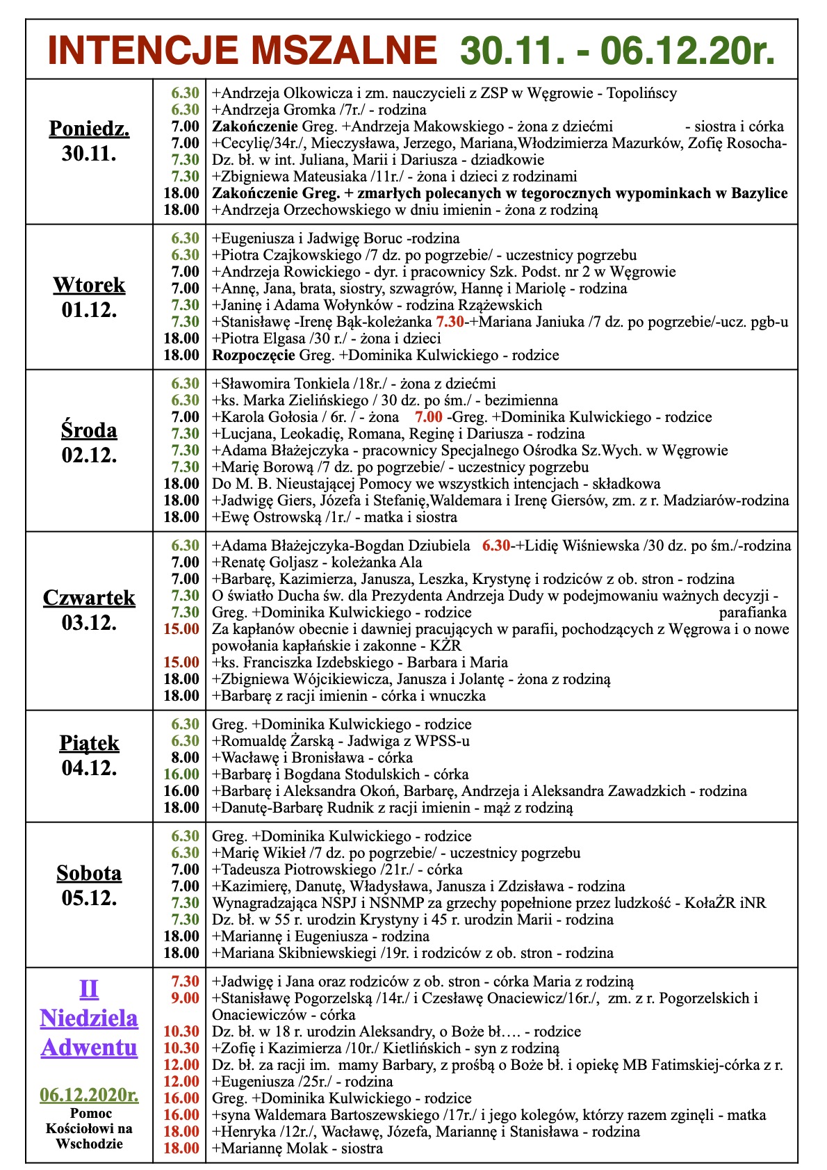 INTENCJE MSZALNE 30.11. – 06.12.2020r.