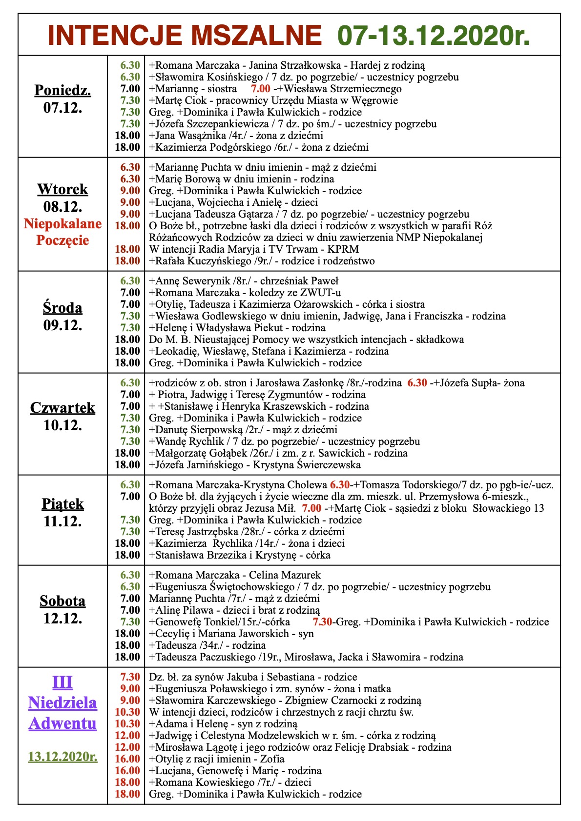 INTENCJE MSZALNE 07-13.12.2020r.
