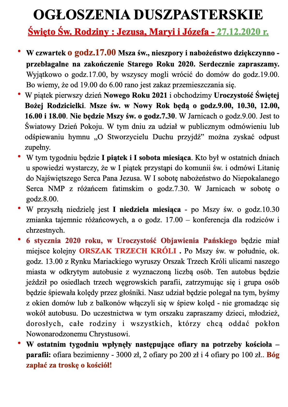 Święto Św. Rodziny : Jezusa, Maryi i Józefa – 27.12.2020 r.