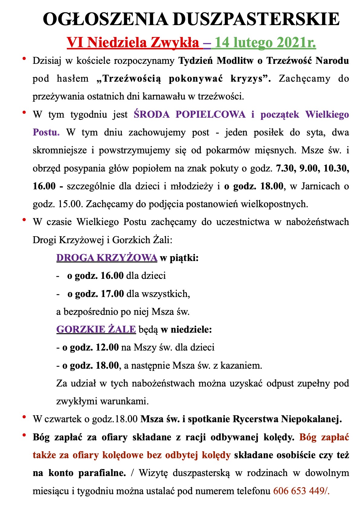 VI Niedziela Zwykła – 14 lutego 2021r.