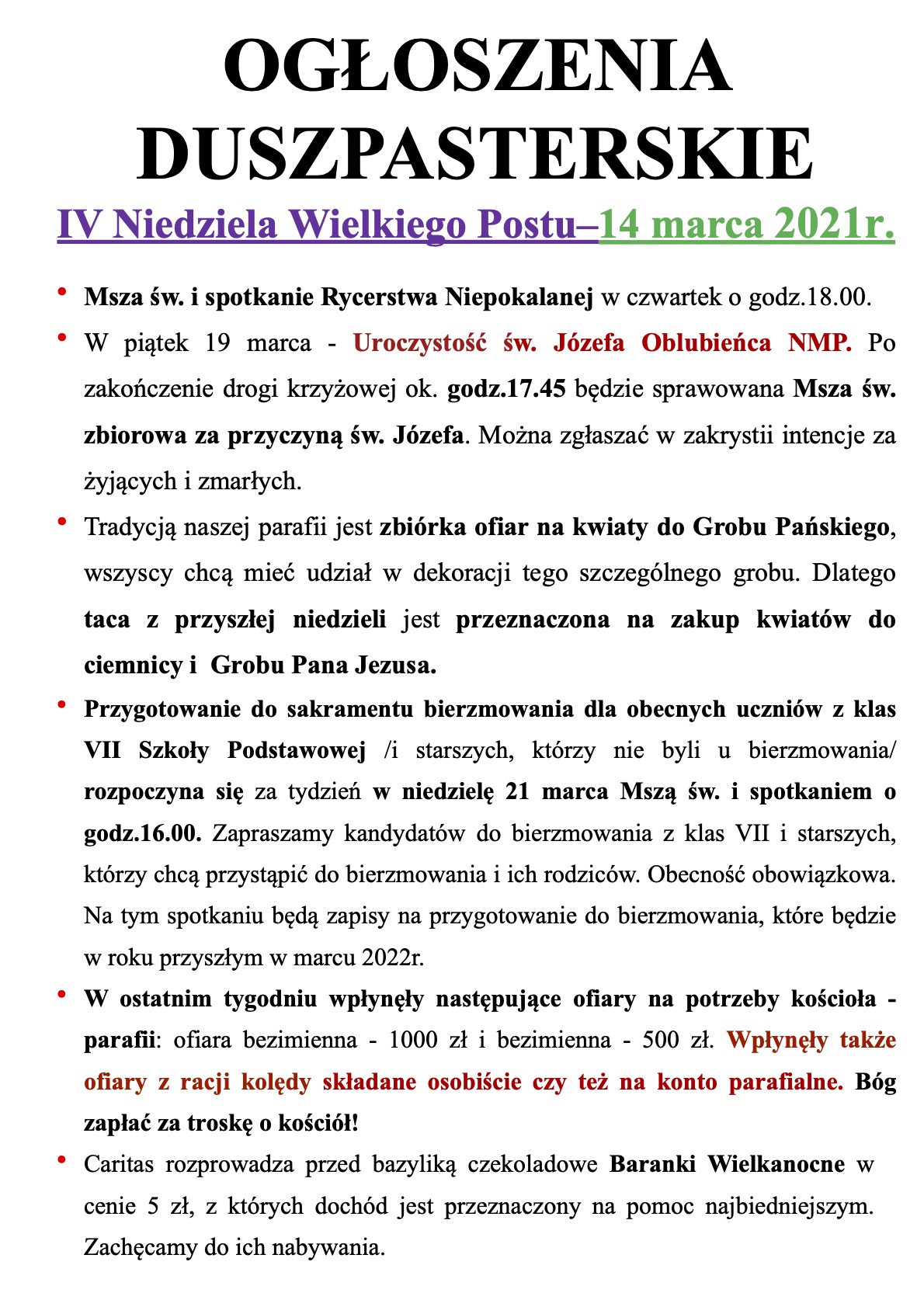 IV Niedziela Wielkiego Postu–14 marca 2021r.