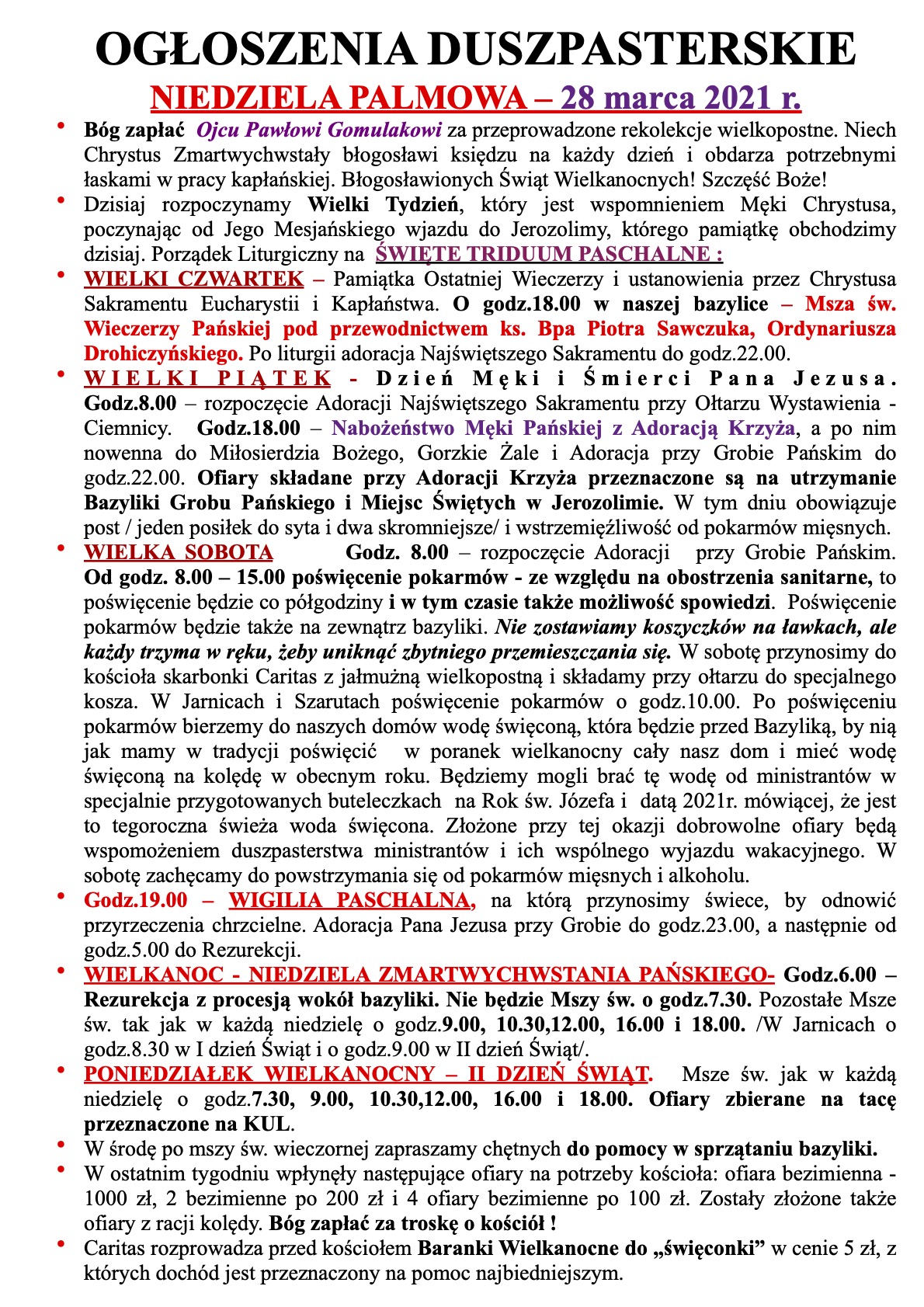 ŻYCZENIA WIELKANOCNE i OGŁOSZENIA DUSZPASTERSKIE WIELKANOC – 4/5 kwietnia 2021r.