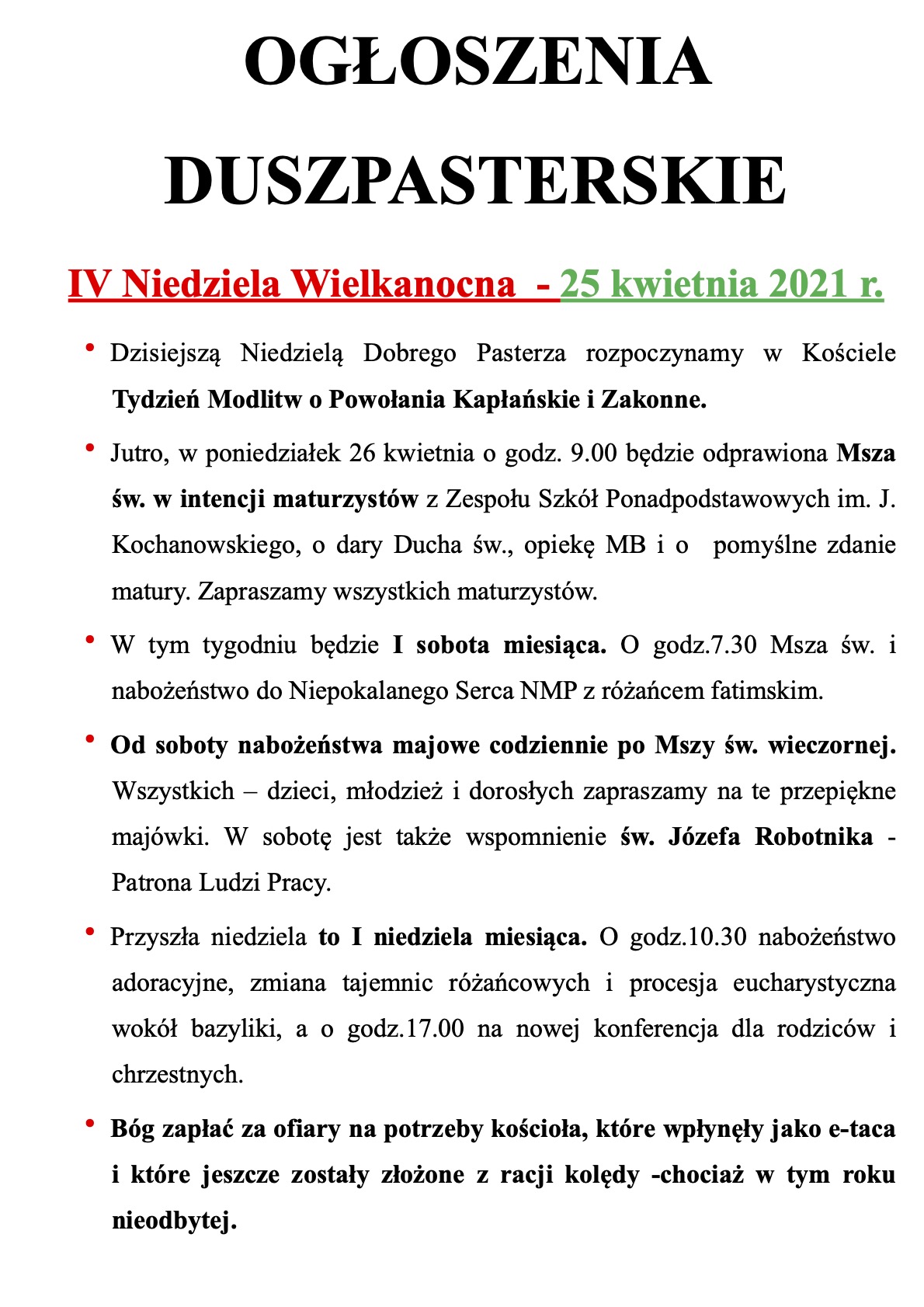 IV Niedziela Wielkanocna – 25 kwietnia 2021 r.