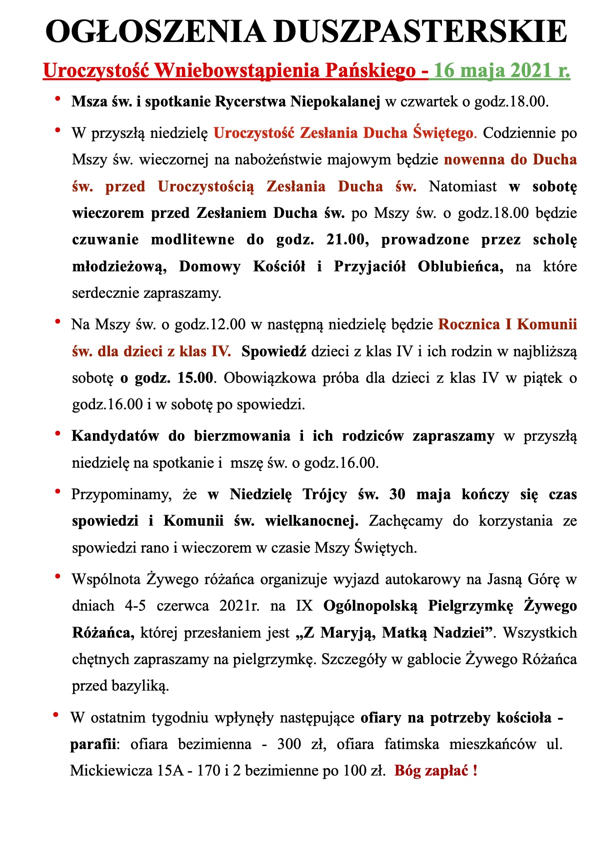 Uroczystość Wniebowstąpienia Pańskiego – 16 maja 2021 r.