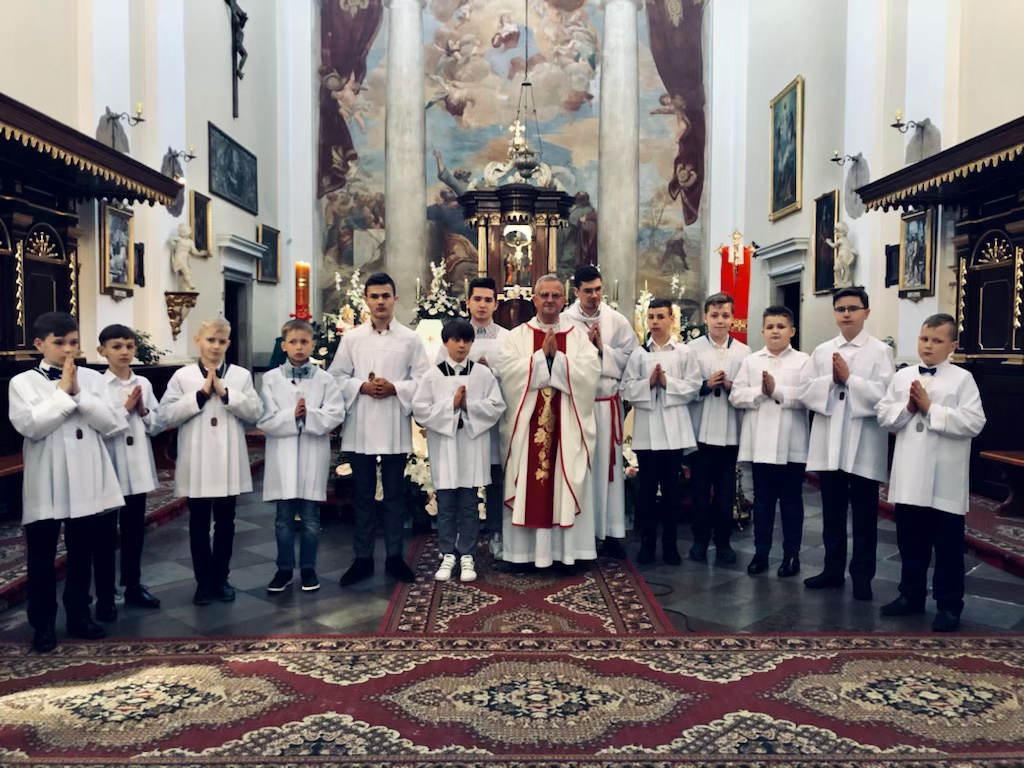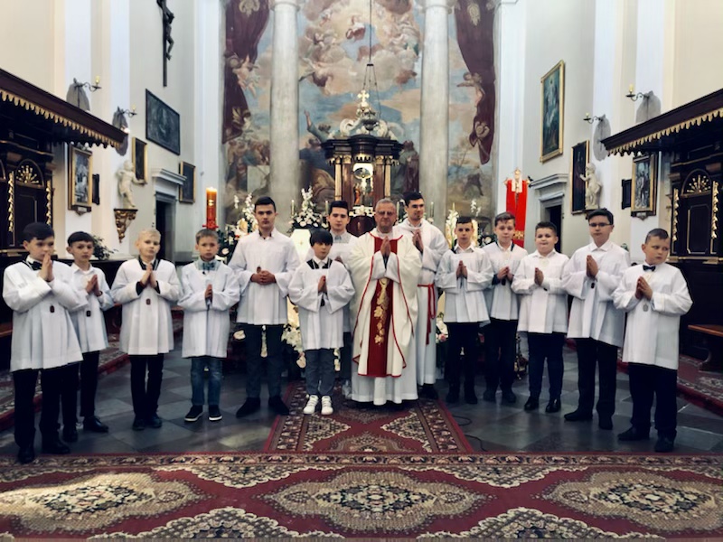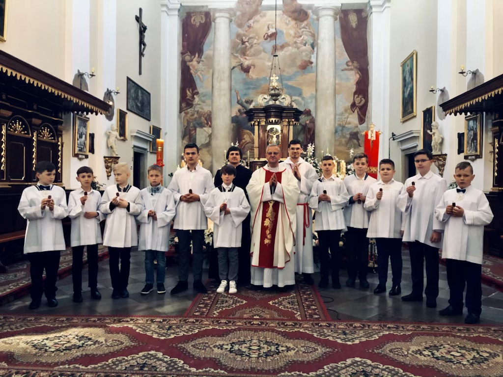 We czwartek, 20 maja 2021 roku, w parafii Wniebowzięcia N.M.P. miał miejsce uroczysty obrzęd nadania ministrantom nowych posług liturgicznych. Wspomniane błogosławieństwo odbyło się podczas Mszy Świętej o godz. 18:00. Proboszcz i dziekan węgrowski, ks. prał. Leszek Gardziński, przyjął kandydaturę siedmiu ministrantów do pełnienia funkcji ministranta światła oraz czterech ministrantów do pełnienia funkcji ministranta kadzielnicy. Sami kandydaci przed zgromadzonymi w świątyni parafianami wyrazili pragnienie służby Bogu i Kościołowi oraz gotowość do pełnienia przyjmowanych obowiązków i funkcji liturgicznych. Ksiądz proboszcz odmówił specjalną modlitwę błogosławieństwa nad ministrantami. Jej treść stanowiła prośbę do Boga Ojca Wszechmogącego o umocnienie w pełnieniu zadań we wspólnocie oraz opiekę nad tymi, którzy chcą poświęcić się służbie w Kościele Katolickim; by dobrze przygotowali się do wypełnienia powierzonych im zadań, a pogłębiając przyjaźń z Jezusem Chrystusem, wzrastali w łasce i mądrości. Modlitwę zakończyło poświęcenie znaczków i szat, które mają przypominać nowo wyświęconym ministrantom o chrześcijańskiej godności i powołaniu do służby liturgicznej.