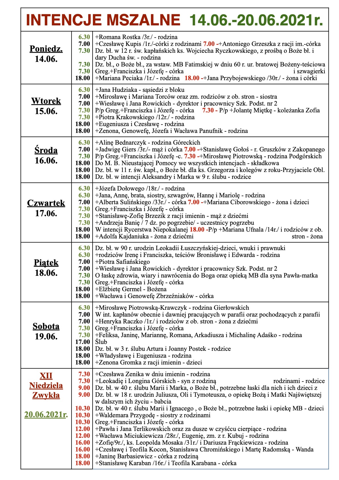 INTENCJE MSZALNE 14.06.-20.06.2021r.