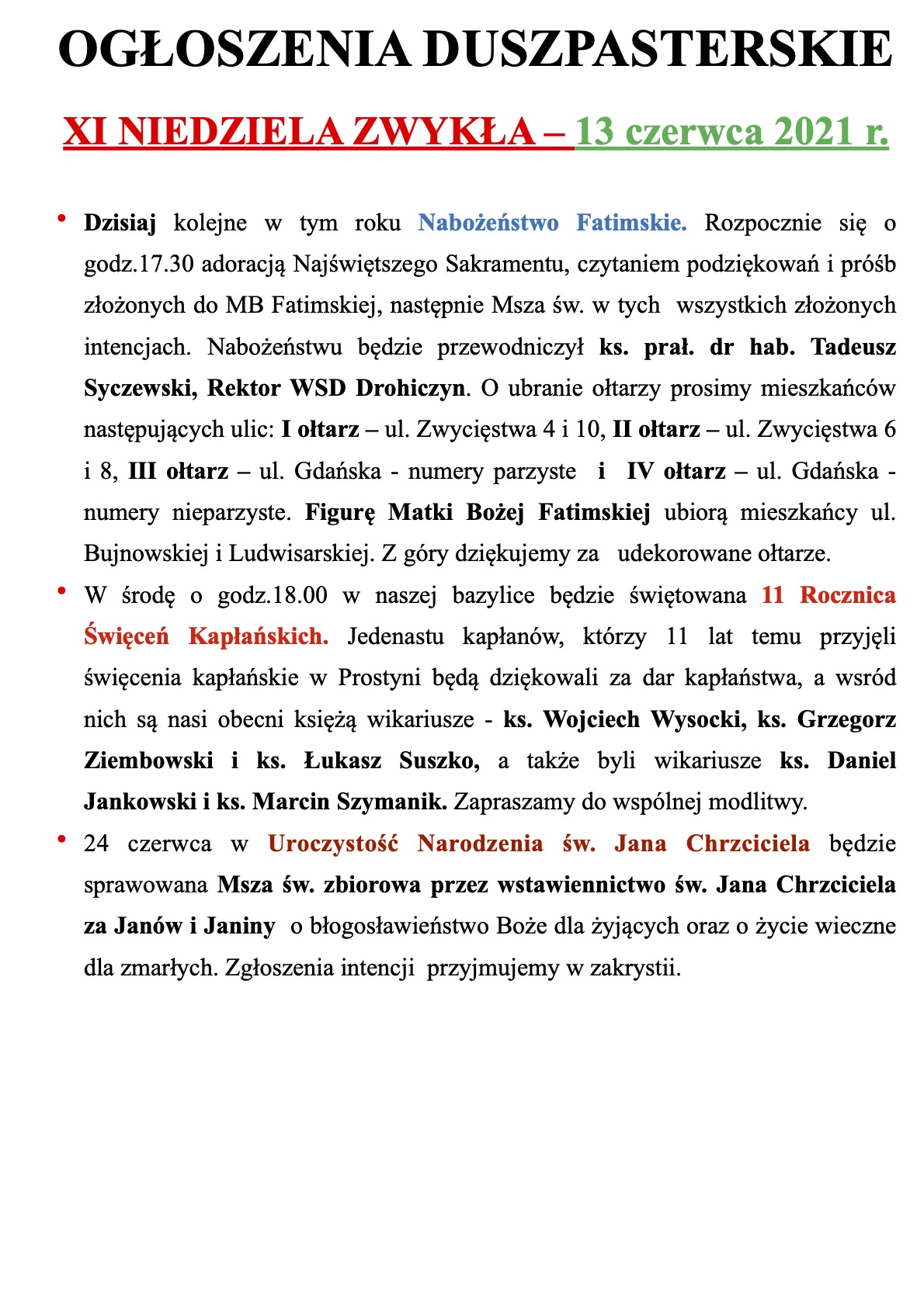 XI NIEDZIELA ZWYKŁA – 13 czerwca 2021 r.