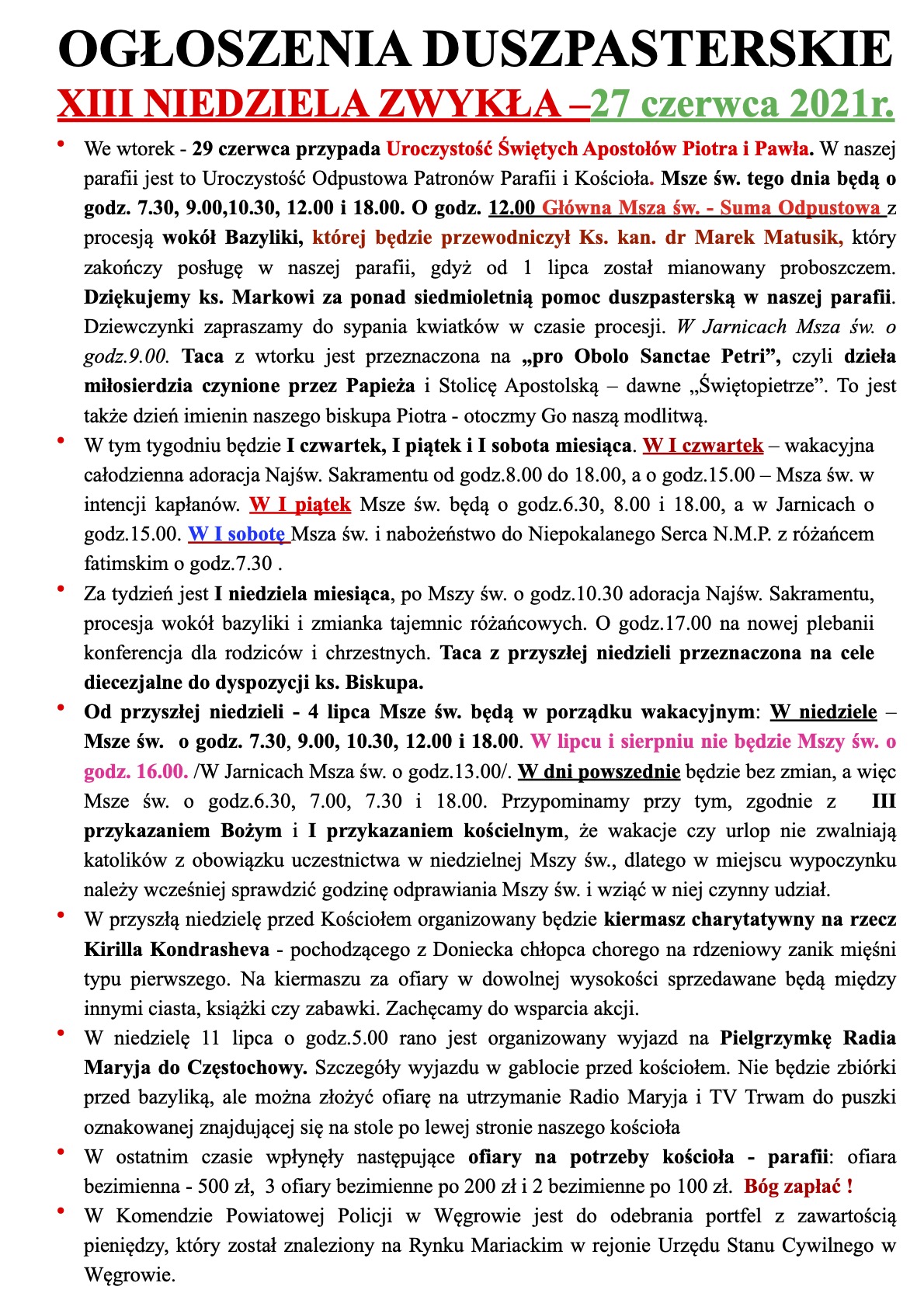 XIII NIEDZIELA ZWYKŁA –27 czerwca 2021r.