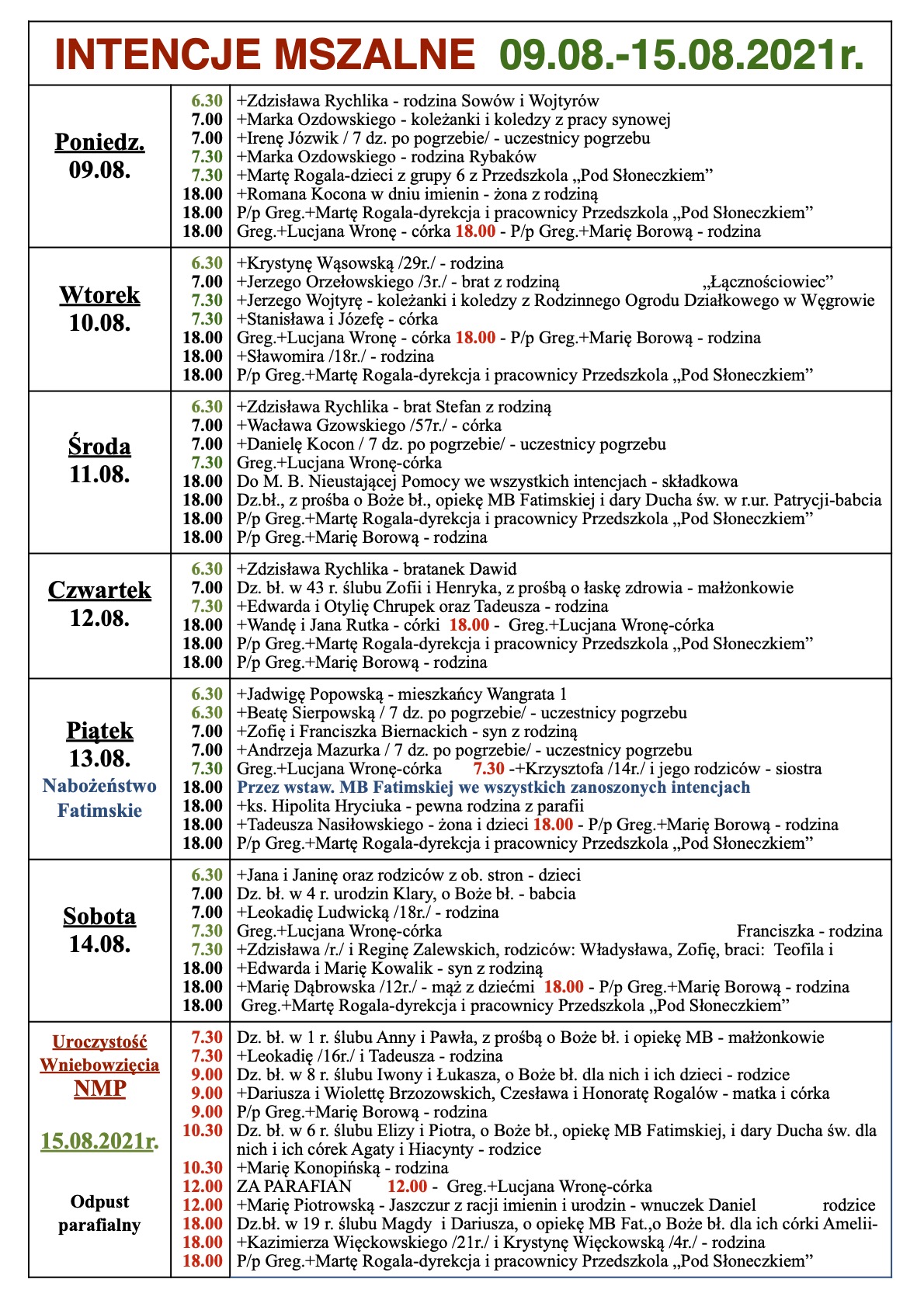 INTENCJE MSZALNE 09.08.-15.08.2021r.