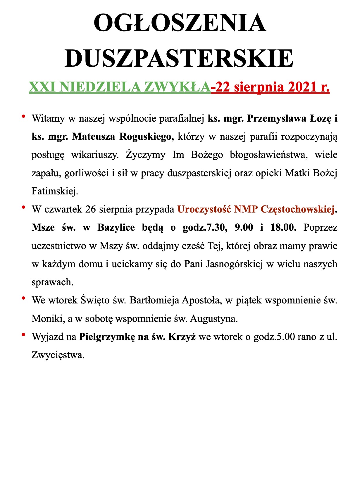 XXI NIEDZIELA ZWYKŁA-22 sierpnia 2021 r.