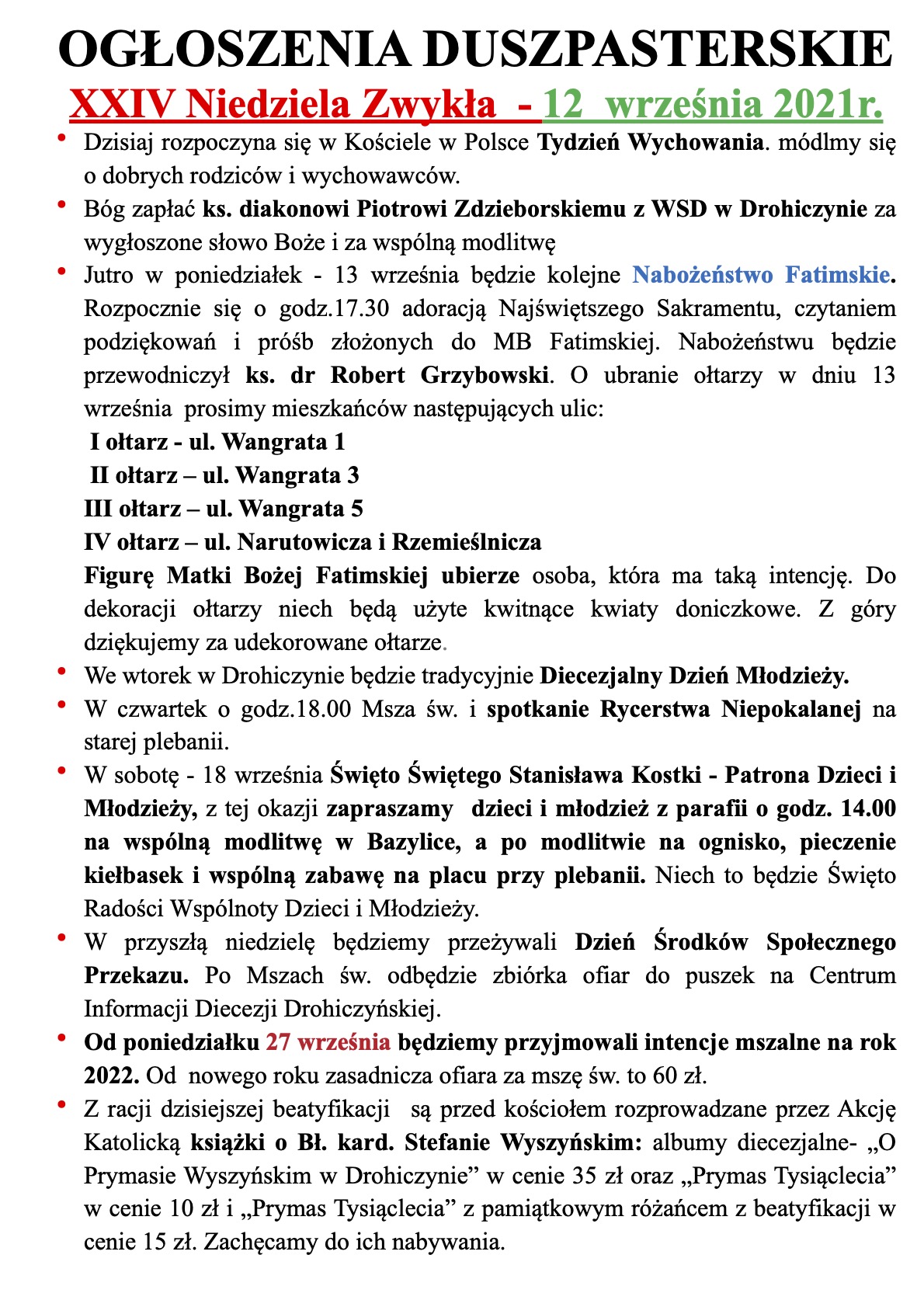 XXIV Niedziela Zwykła – 12 września 2021r.