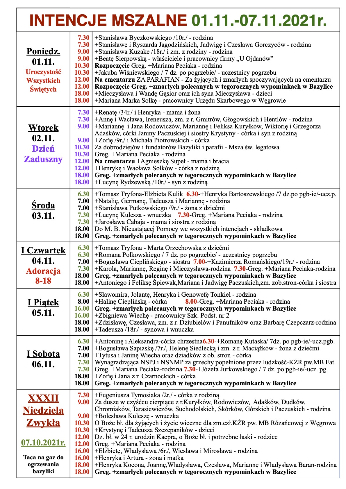 INTENCJE MSZALNE 01.11.-07.11.2021r.