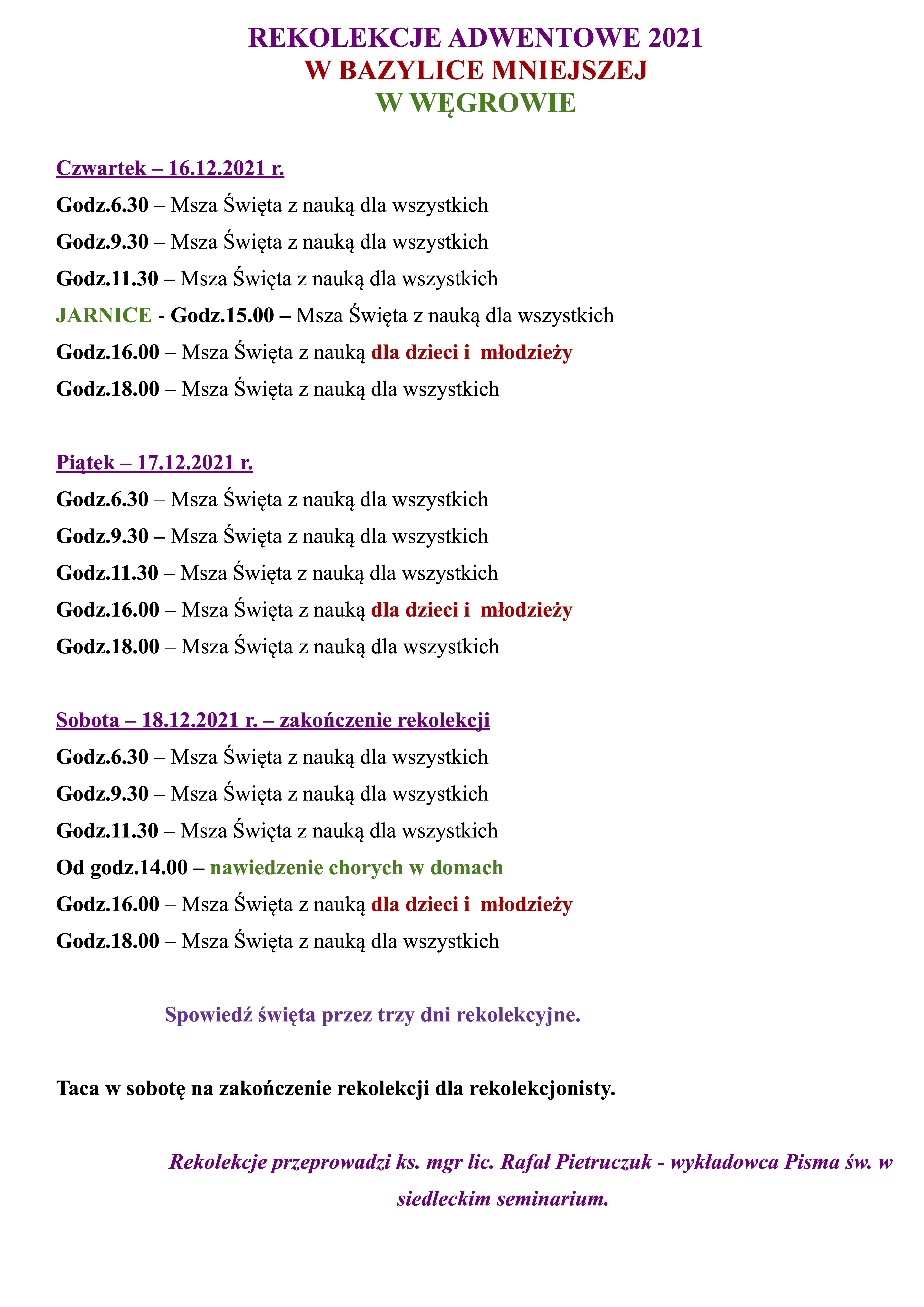 PROGRAM REKOLEKCJI ADWENTOWYCH 16, 17 i 18 GRUDNIA 2021r. w BAZYLICE MNIEJSZEJ W WĘGROWIE przez Ks. Proboszcz / 4 lata temu