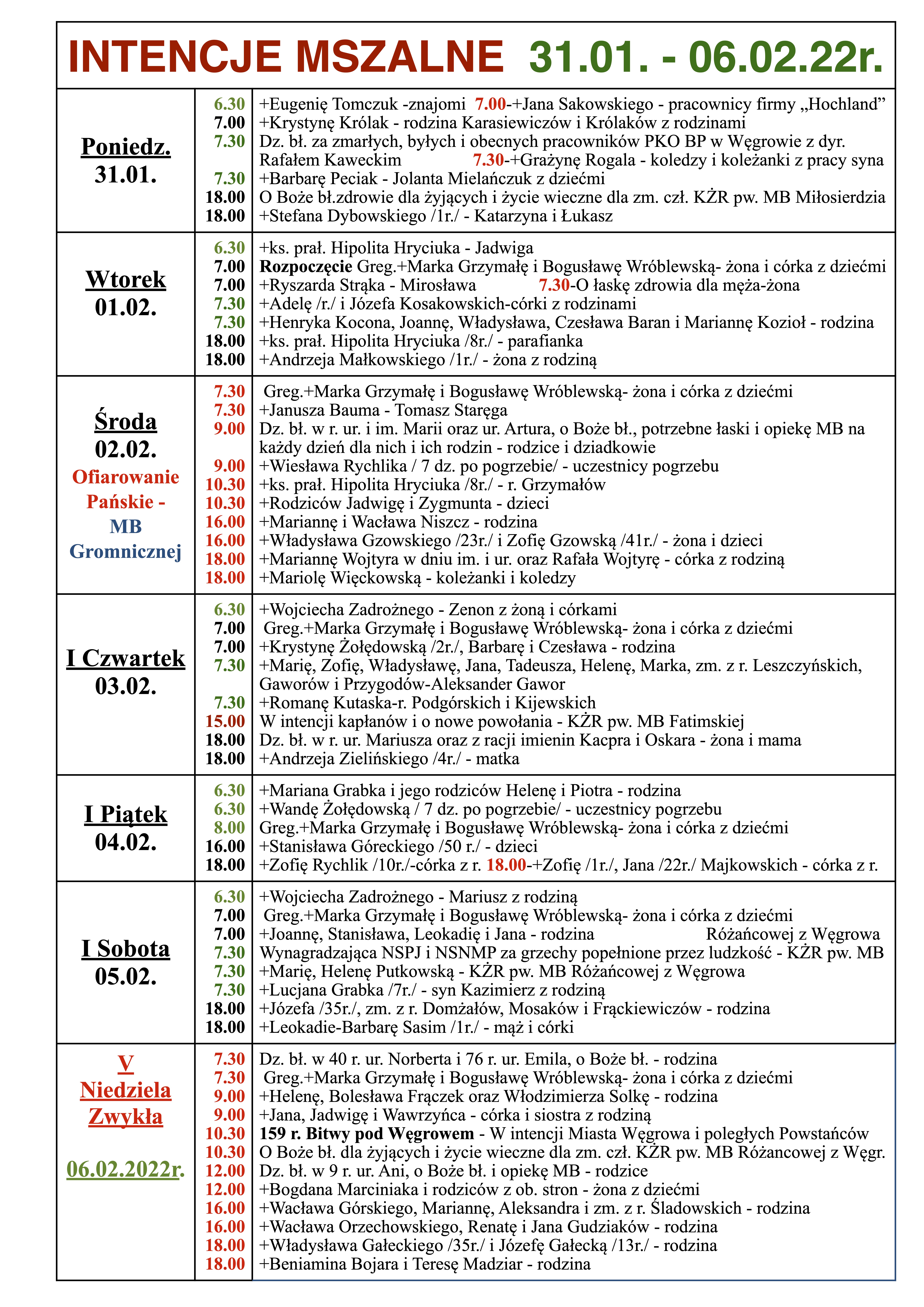 INTENCJE MSZALNE 31.01. – 06.02.22r.