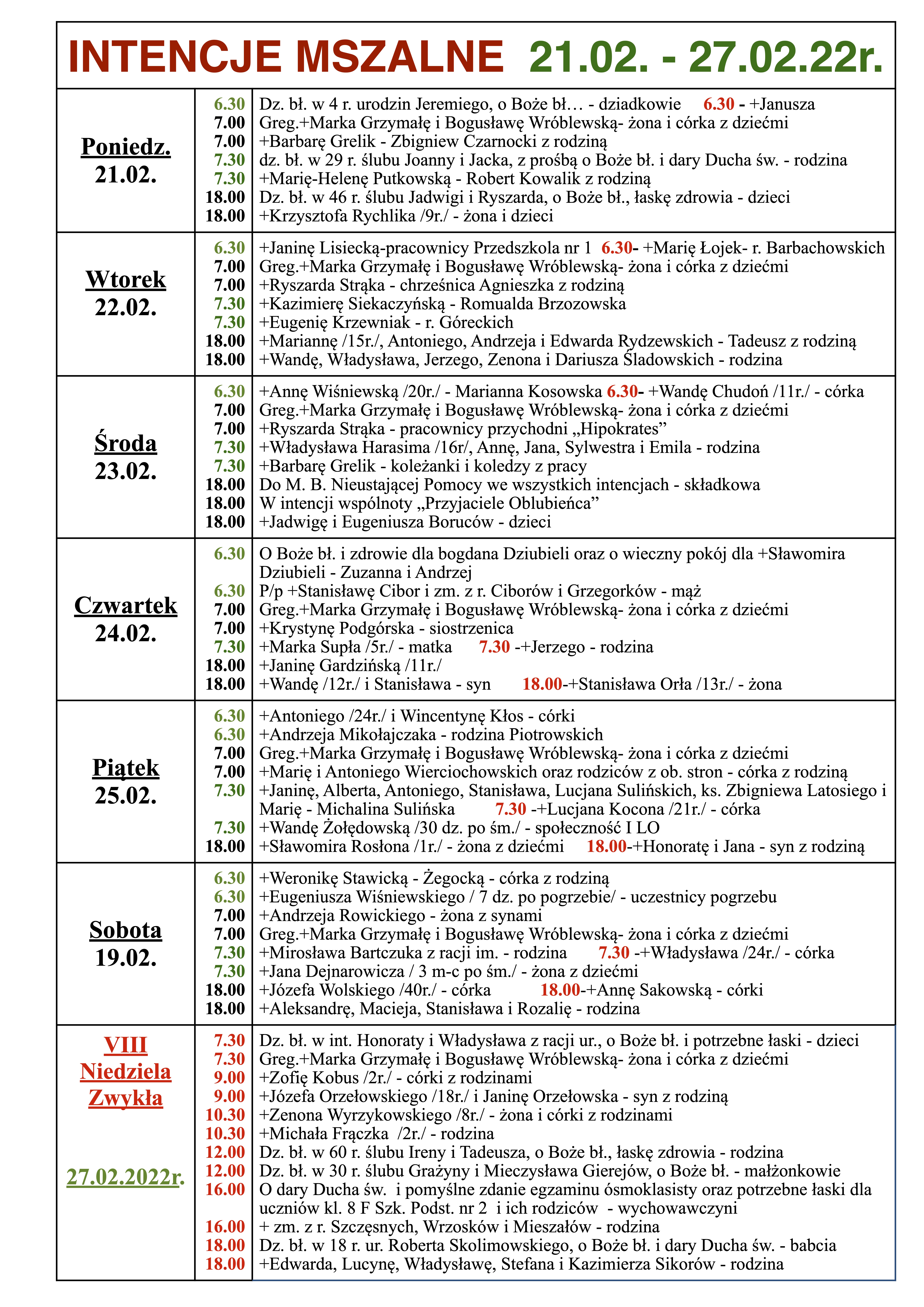INTENCJE MSZALNE 21.02. – 27.02.22r.