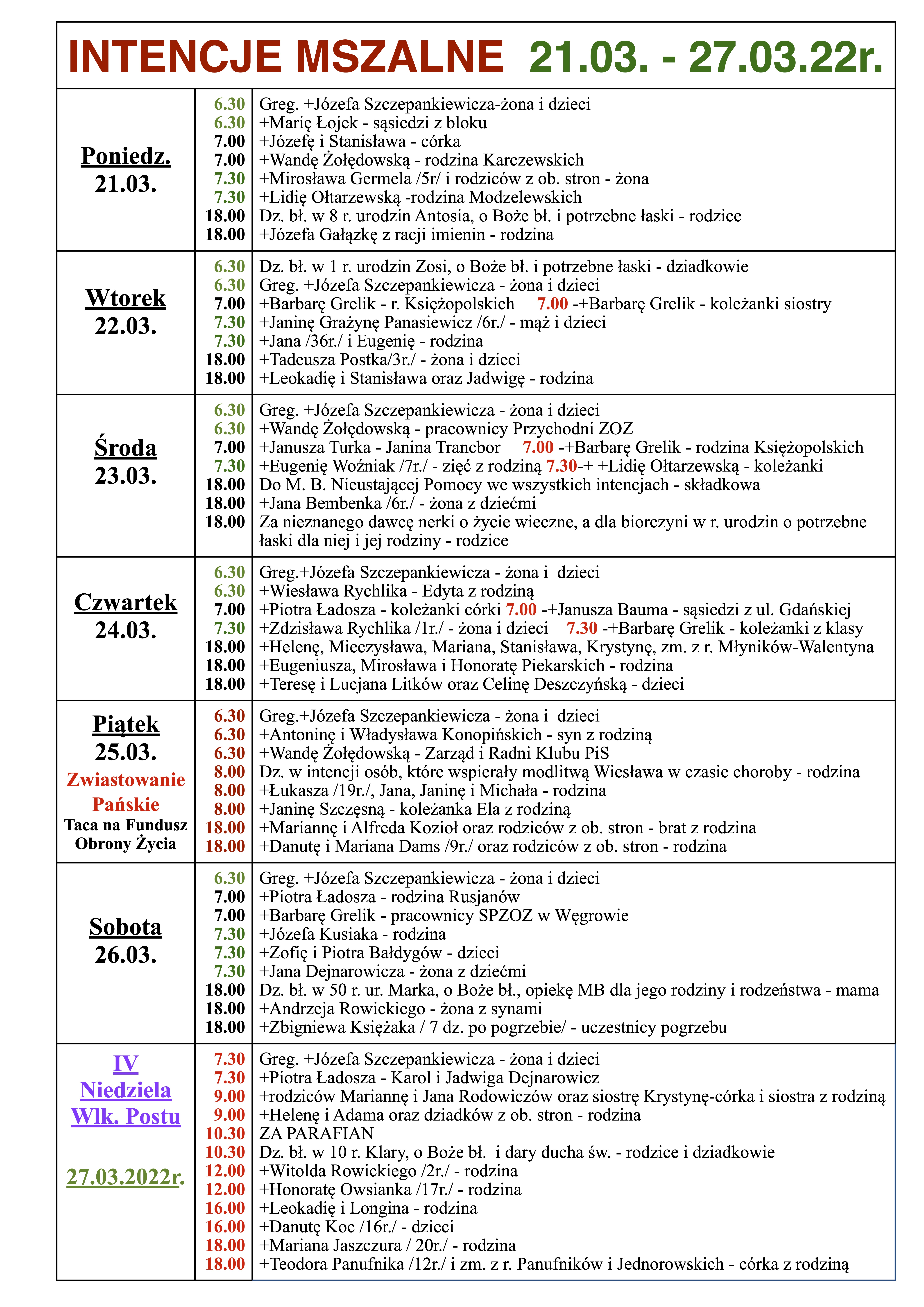 INTENCJE MSZALNE 21.03. – 27.03.22r.