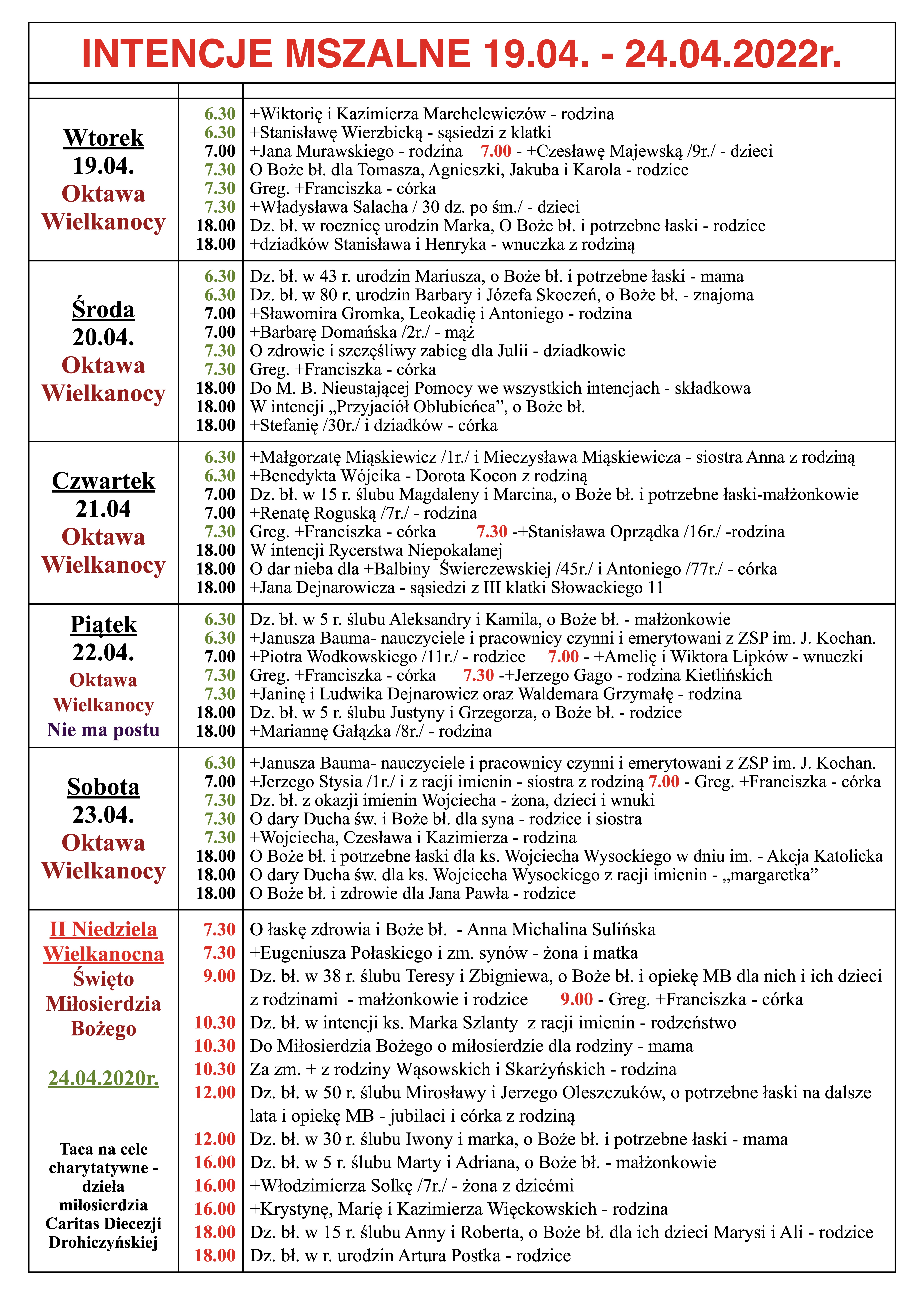 INTENCJE MSZALNE 19.04. – 24.04.2022r.