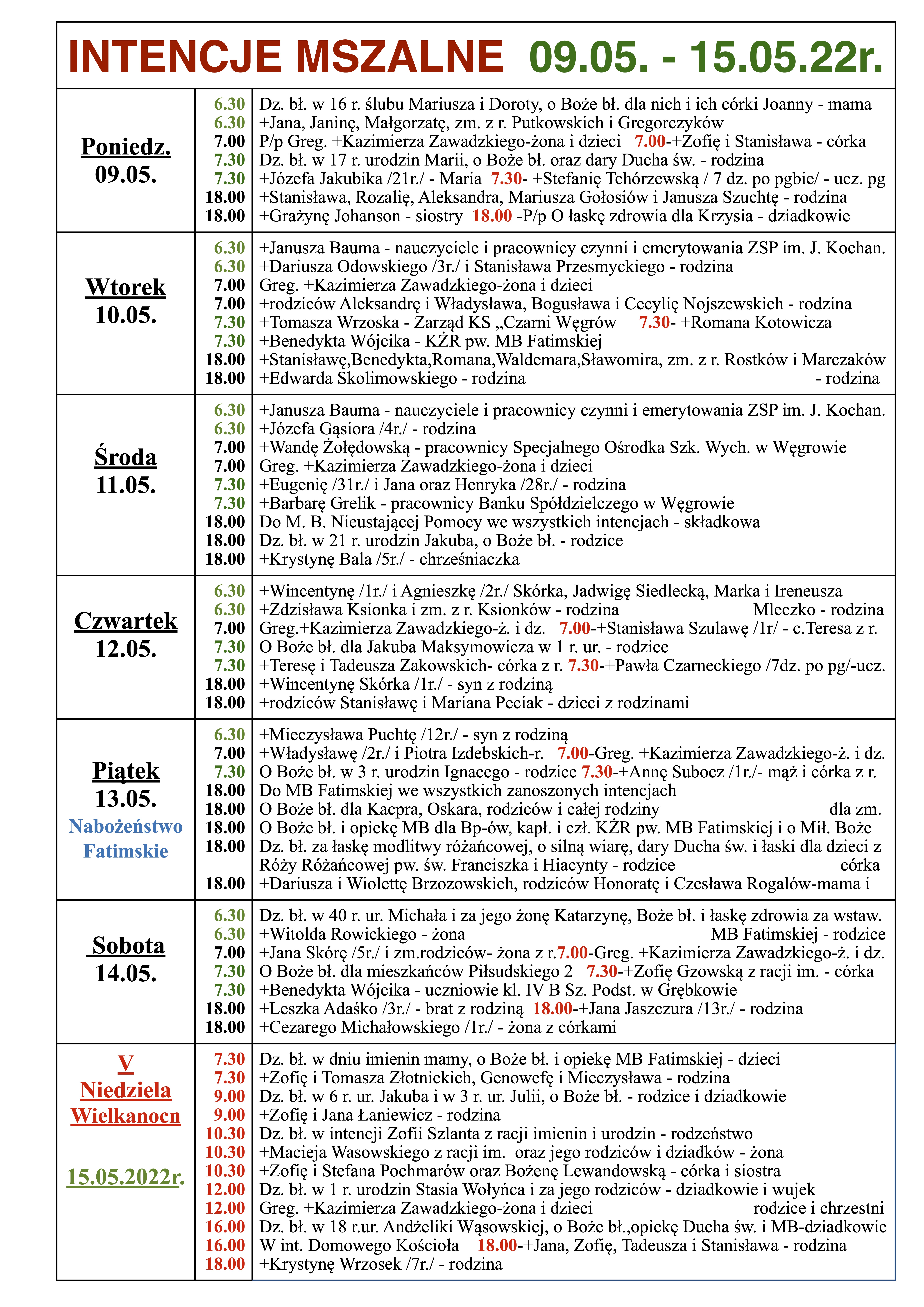 INTENCJE MSZALNE 09.05. – 15.05.22r.