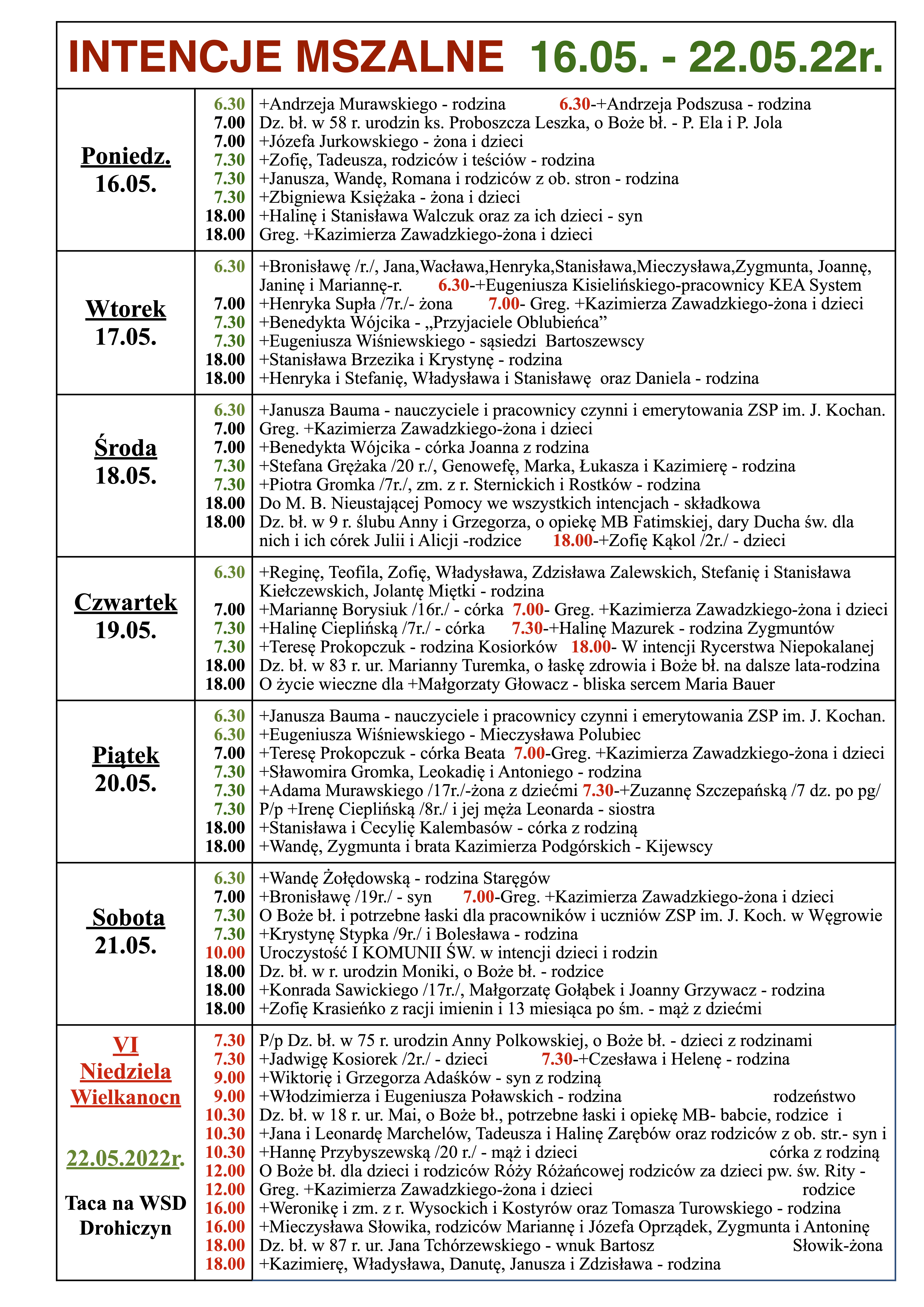 INTENCJE MSZALNE 16.05. – 22.05.22r.