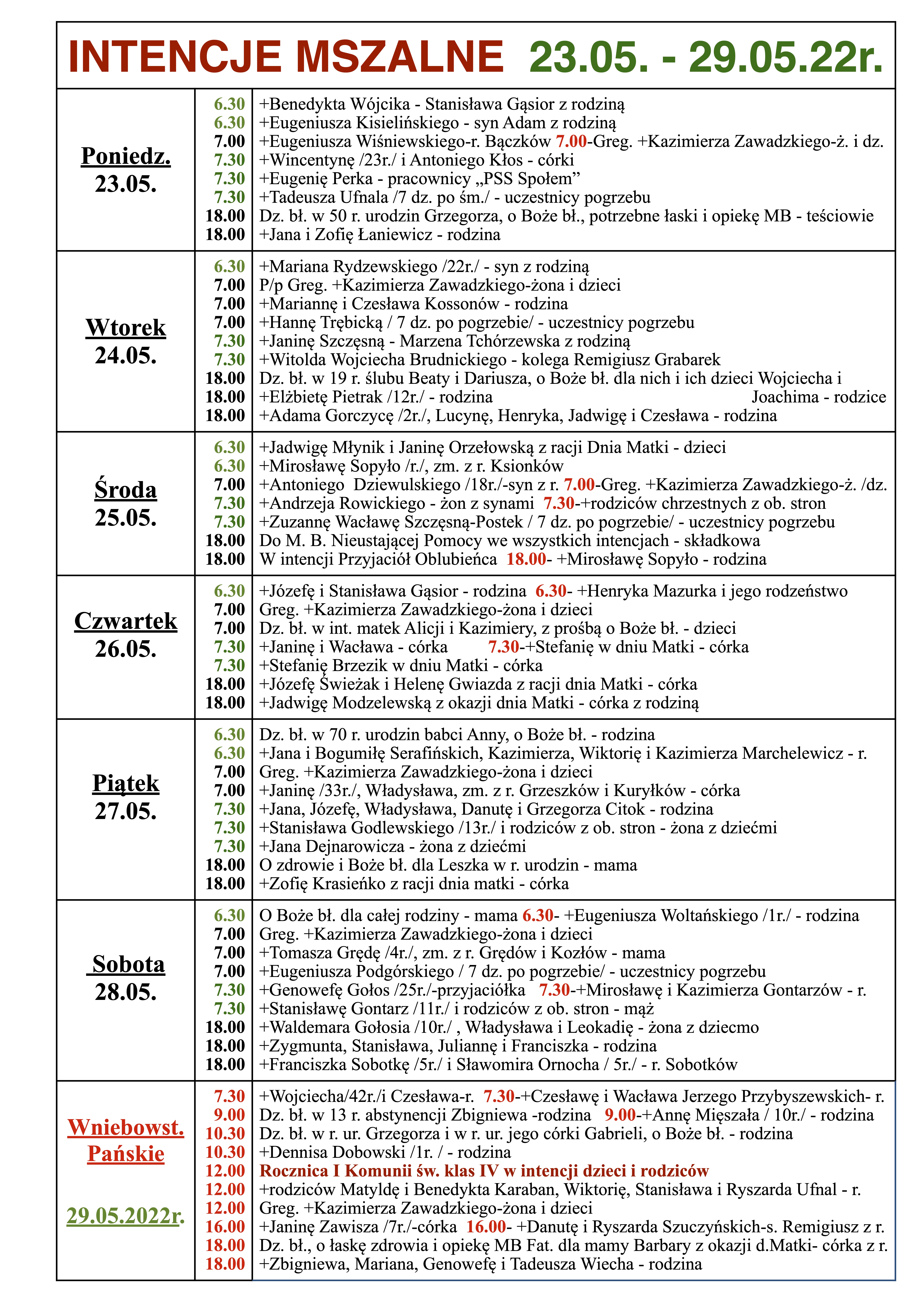 INTENCJE MSZALNE 23.05. – 29.05.22r.