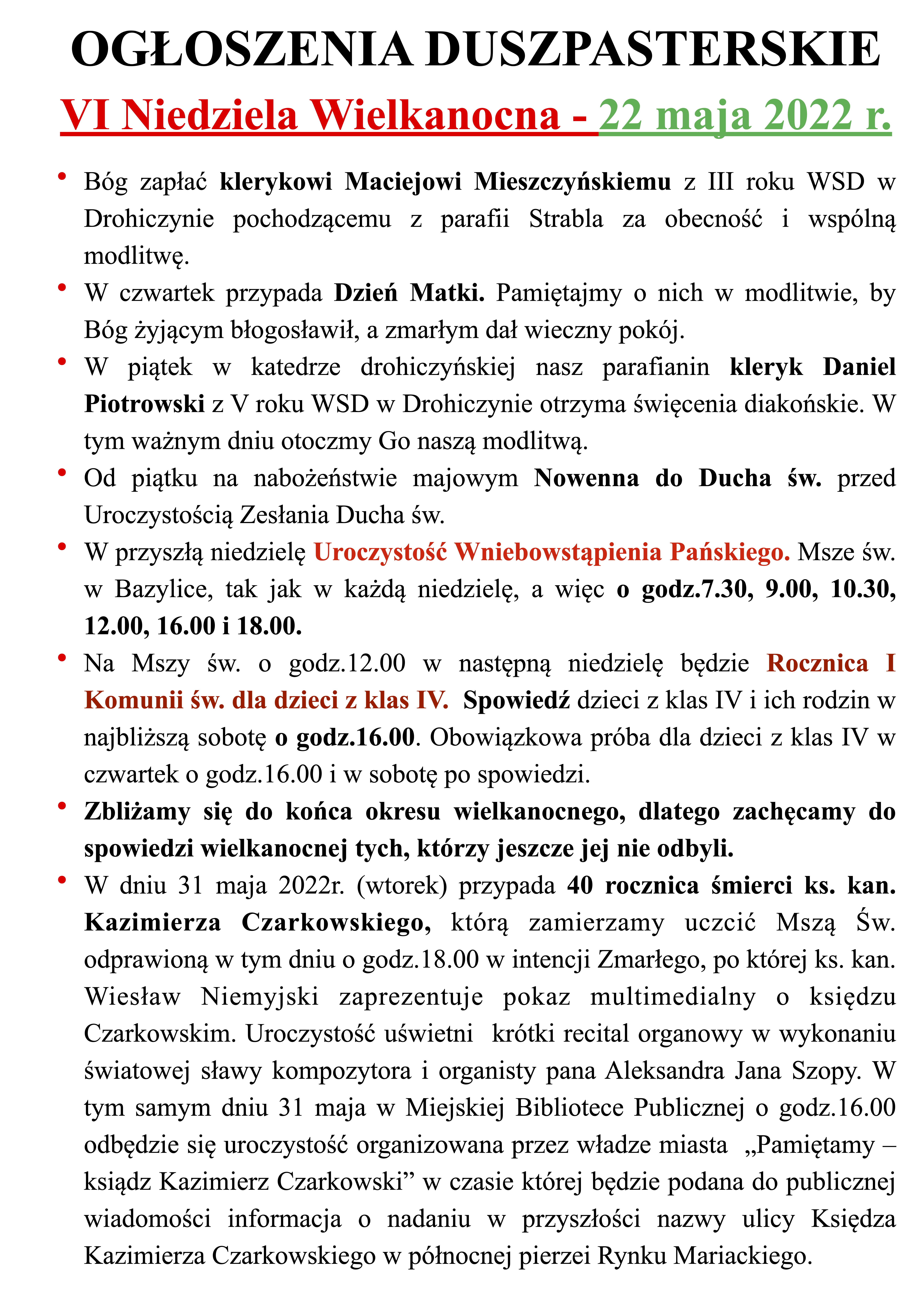 VI Niedziela Wielkanocna – 22 maja 2022 r.