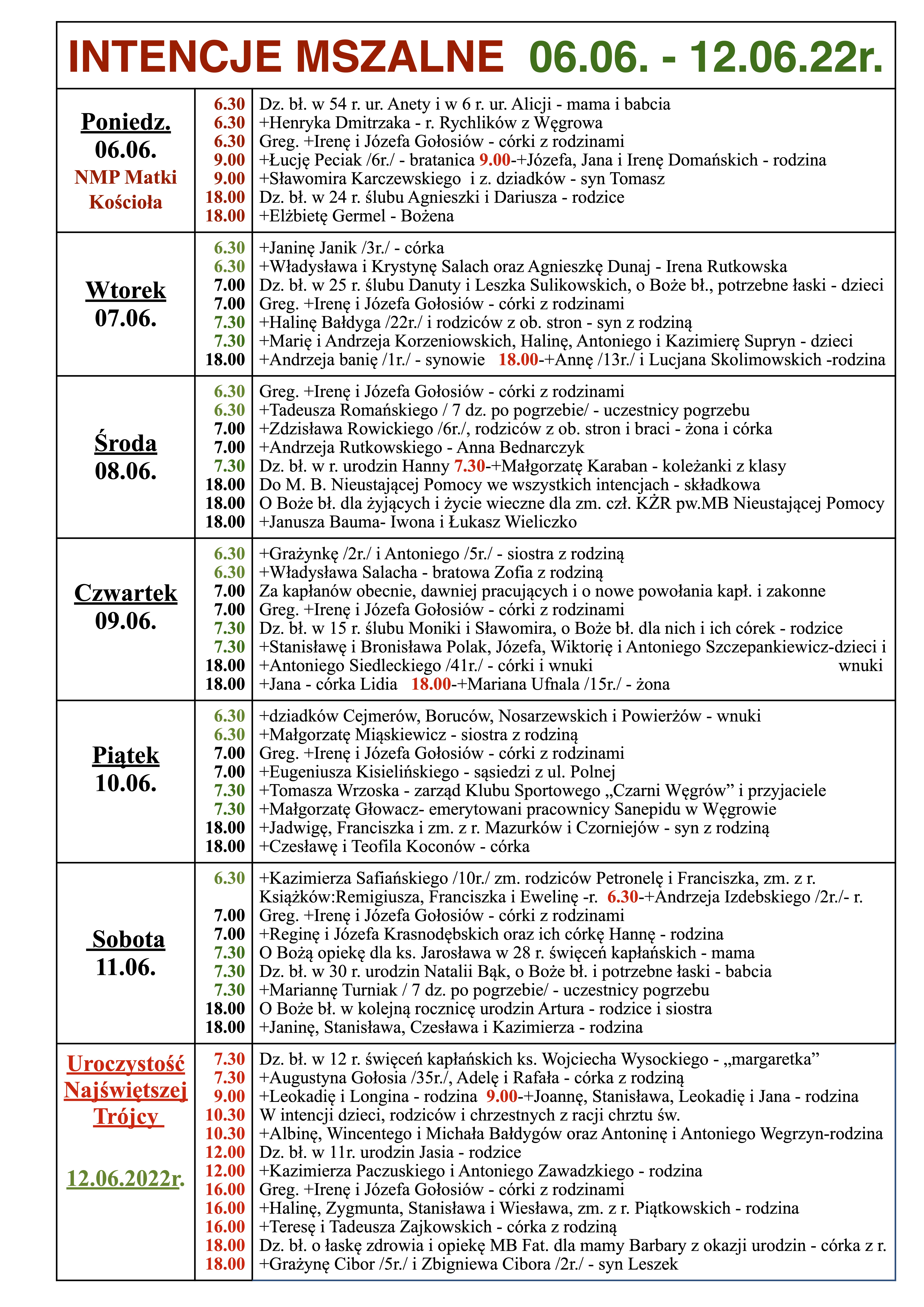 INTENCJE MSZALNE 06.06. – 12.06.22r.