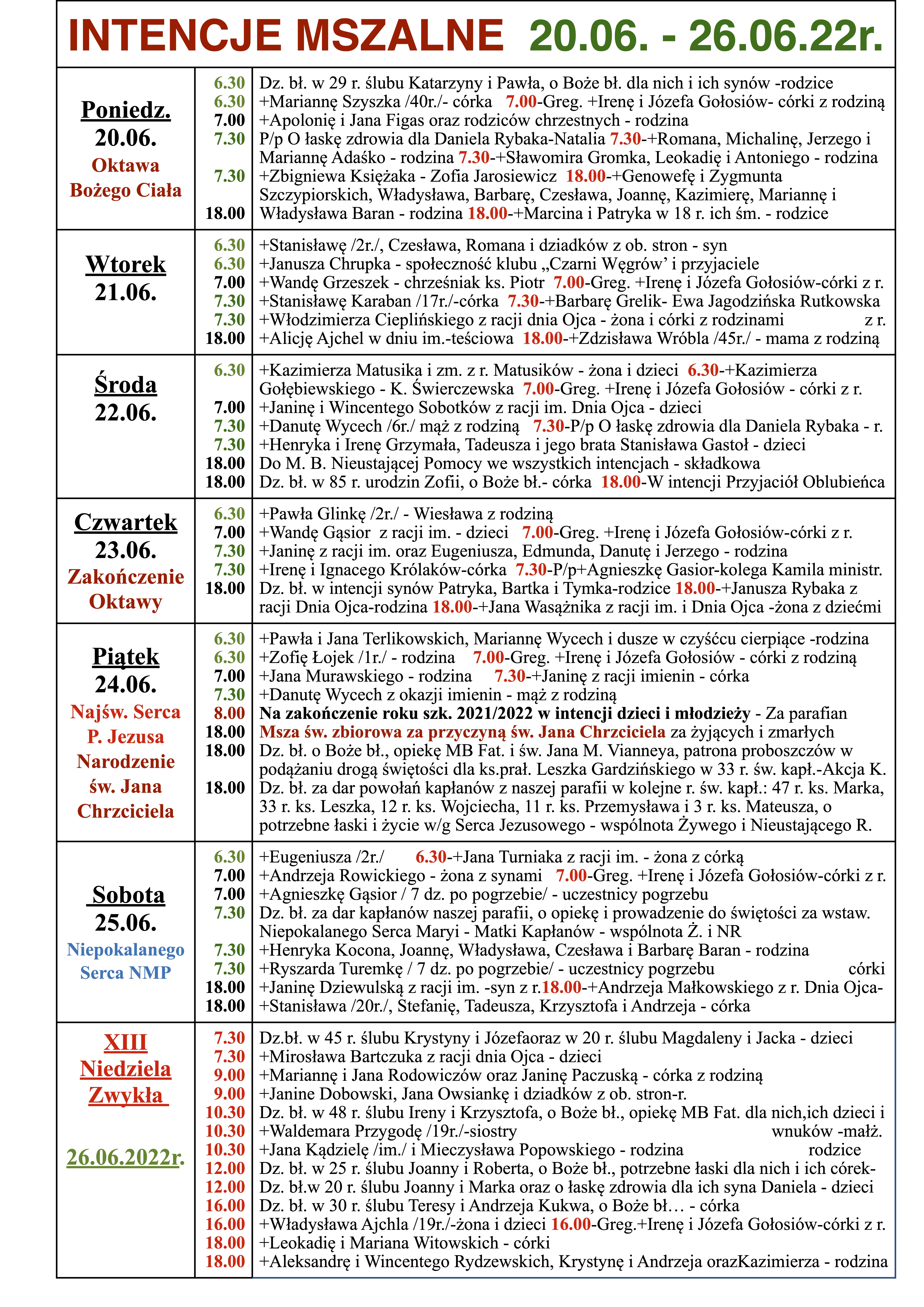 INTENCJE MSZALNE 20.06. – 26.06.22r.