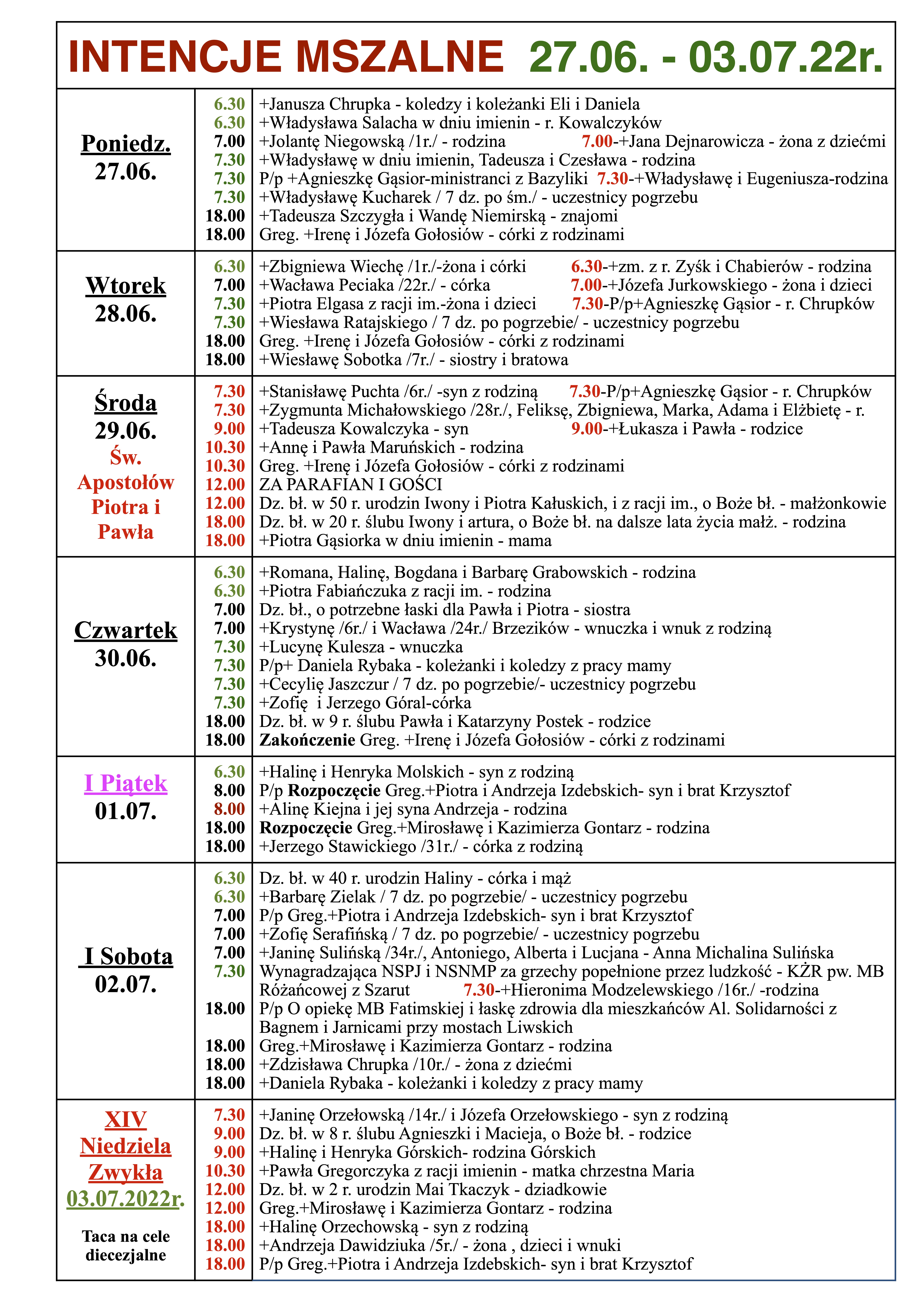 INTENCJE MSZALNE 27.06. – 03.07.22r.