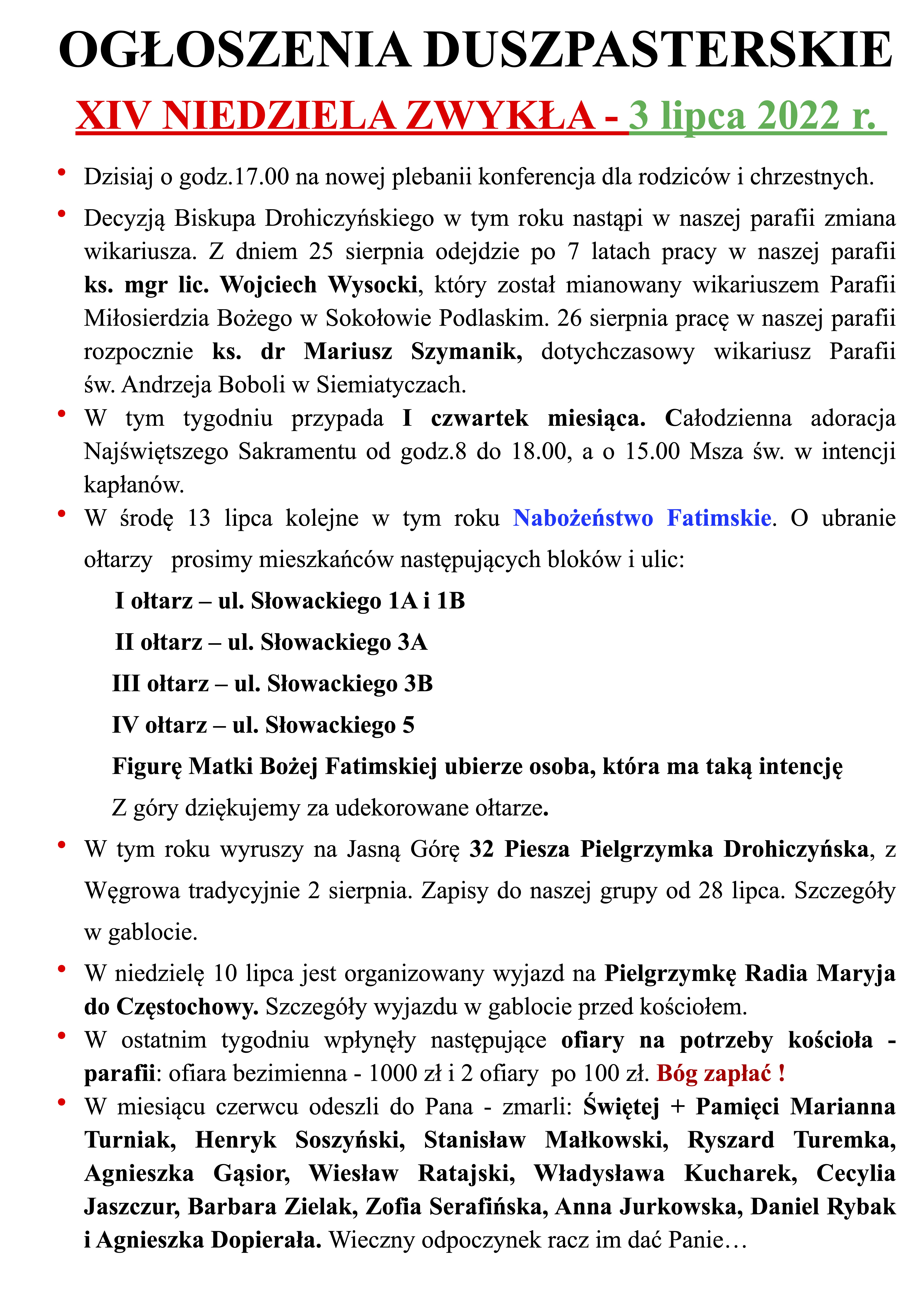 XIV NIEDZIELA ZWYKŁA – 3 lipca 2022 r.