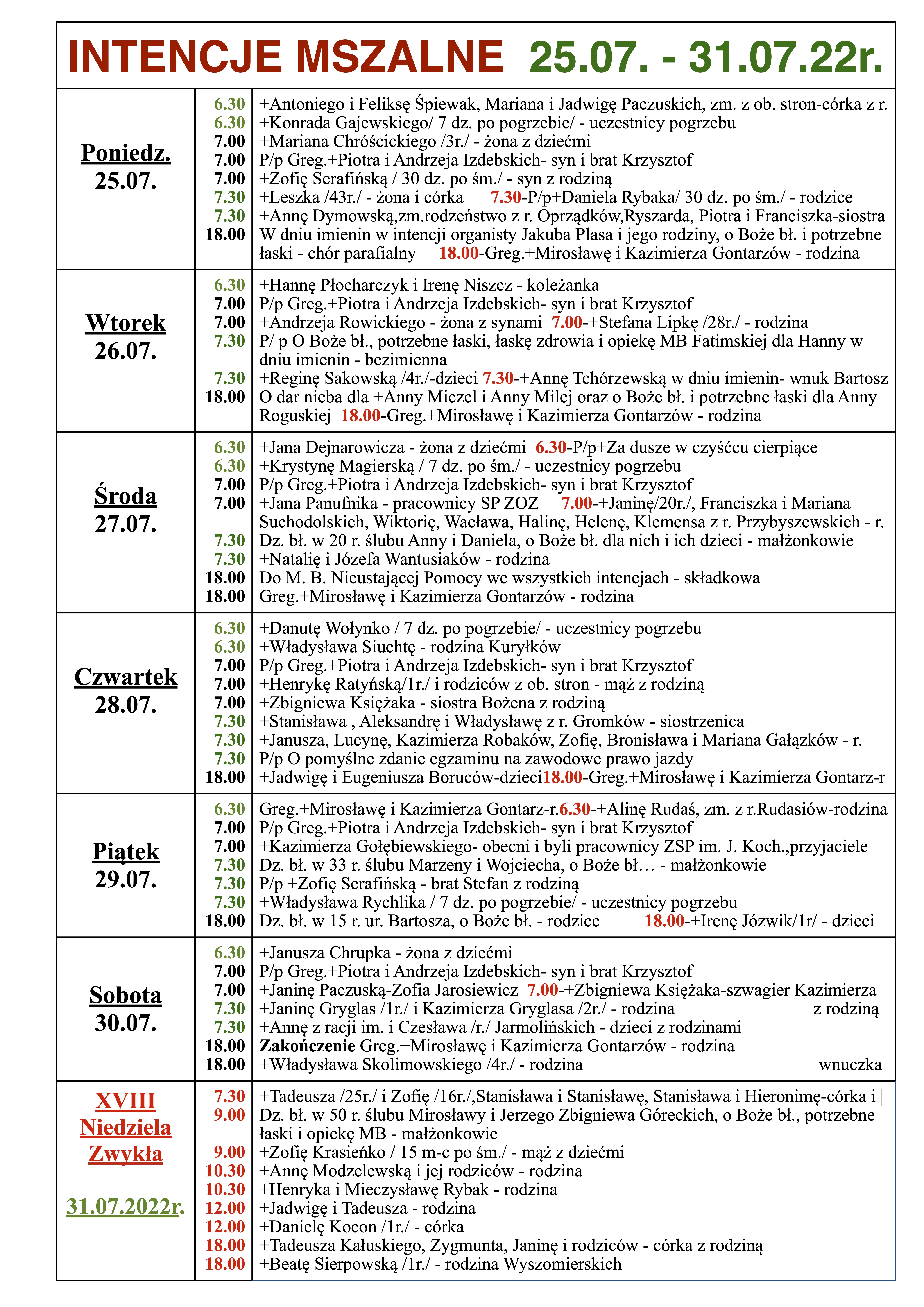 INTENCJE MSZALNE 25.07. – 31.07.22r.