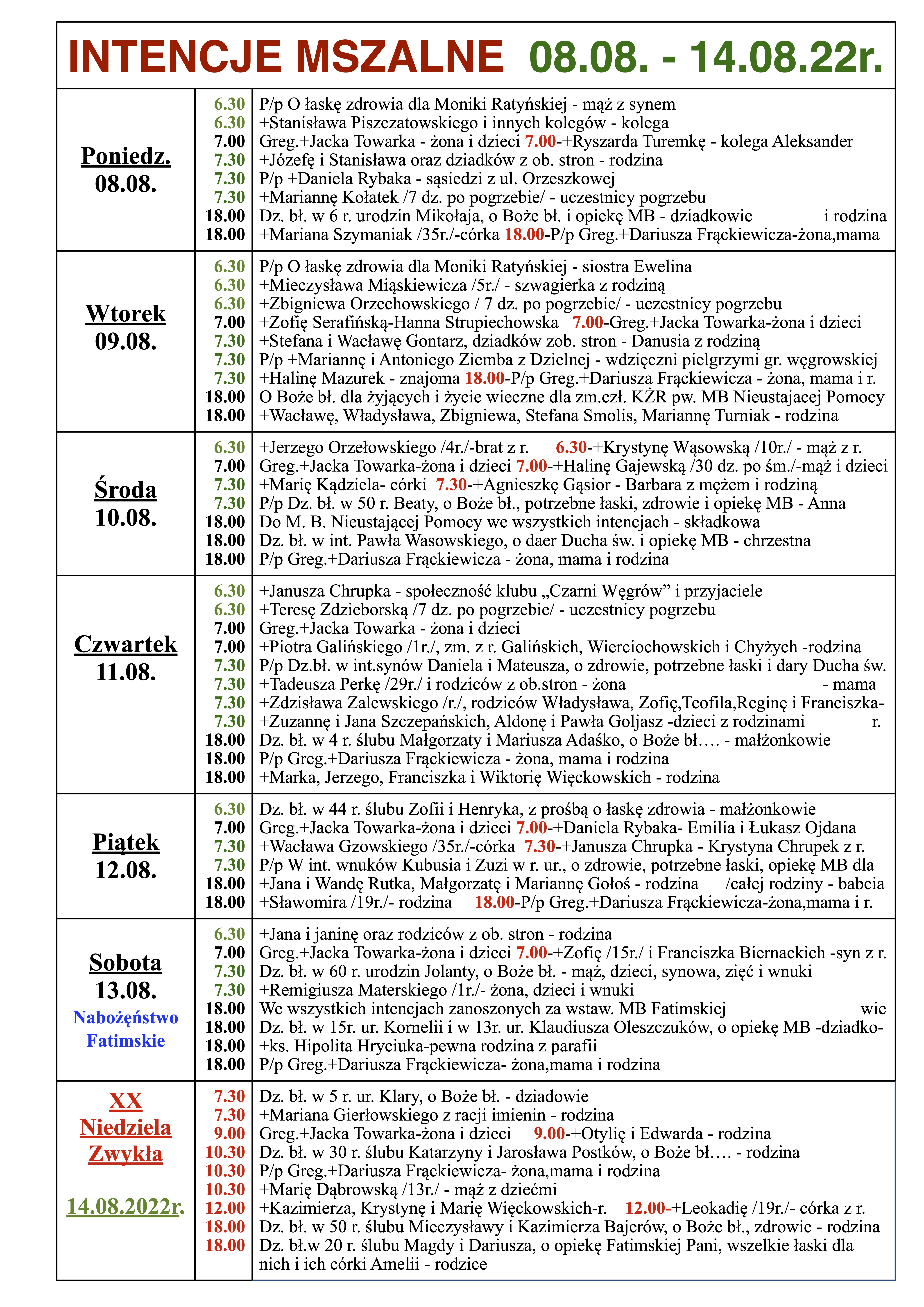 INTENCJE MSZALNE 08.08. – 14.08.22r.