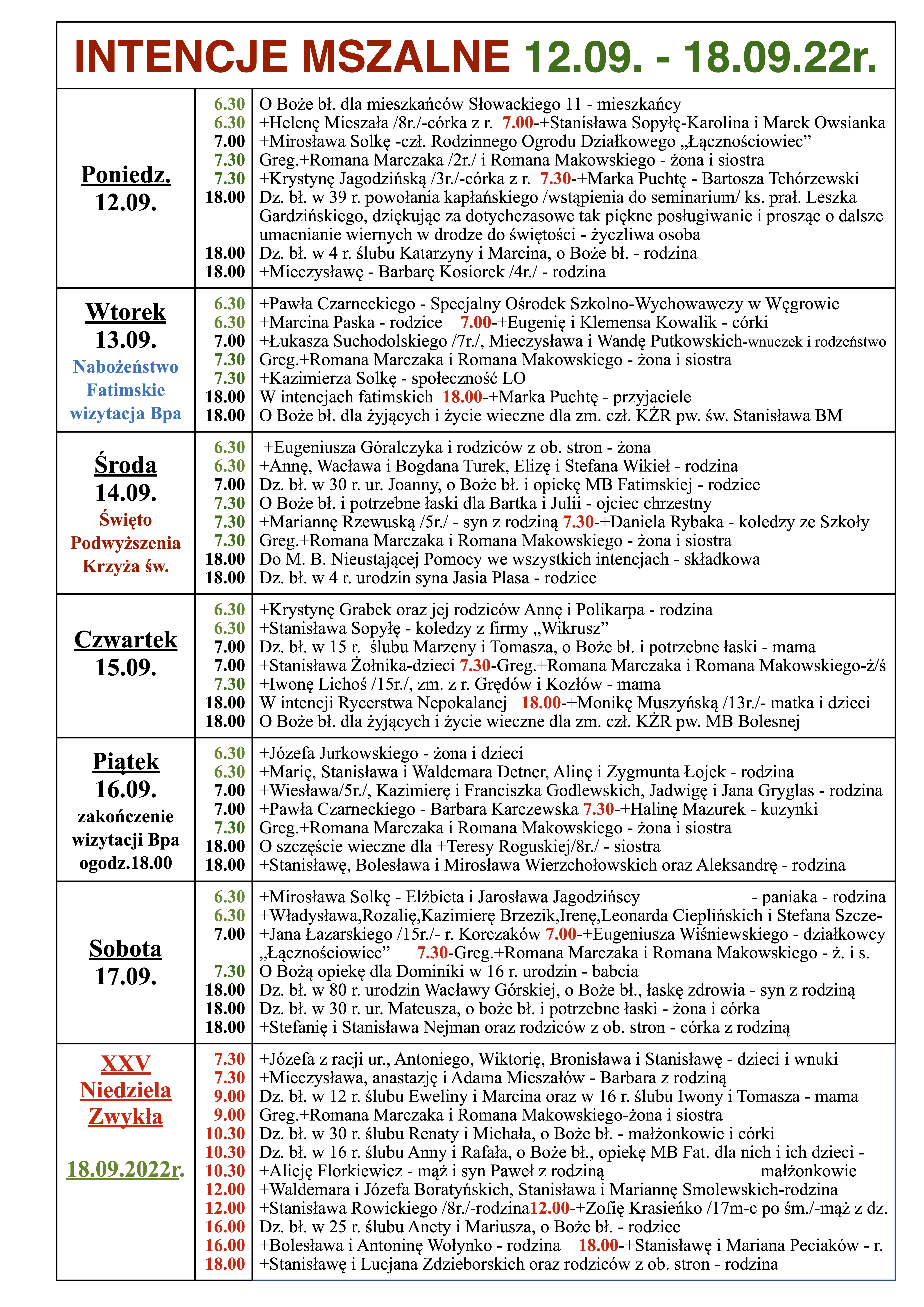 INTENCJE MSZALNE 12.09. – 18.09.22r.