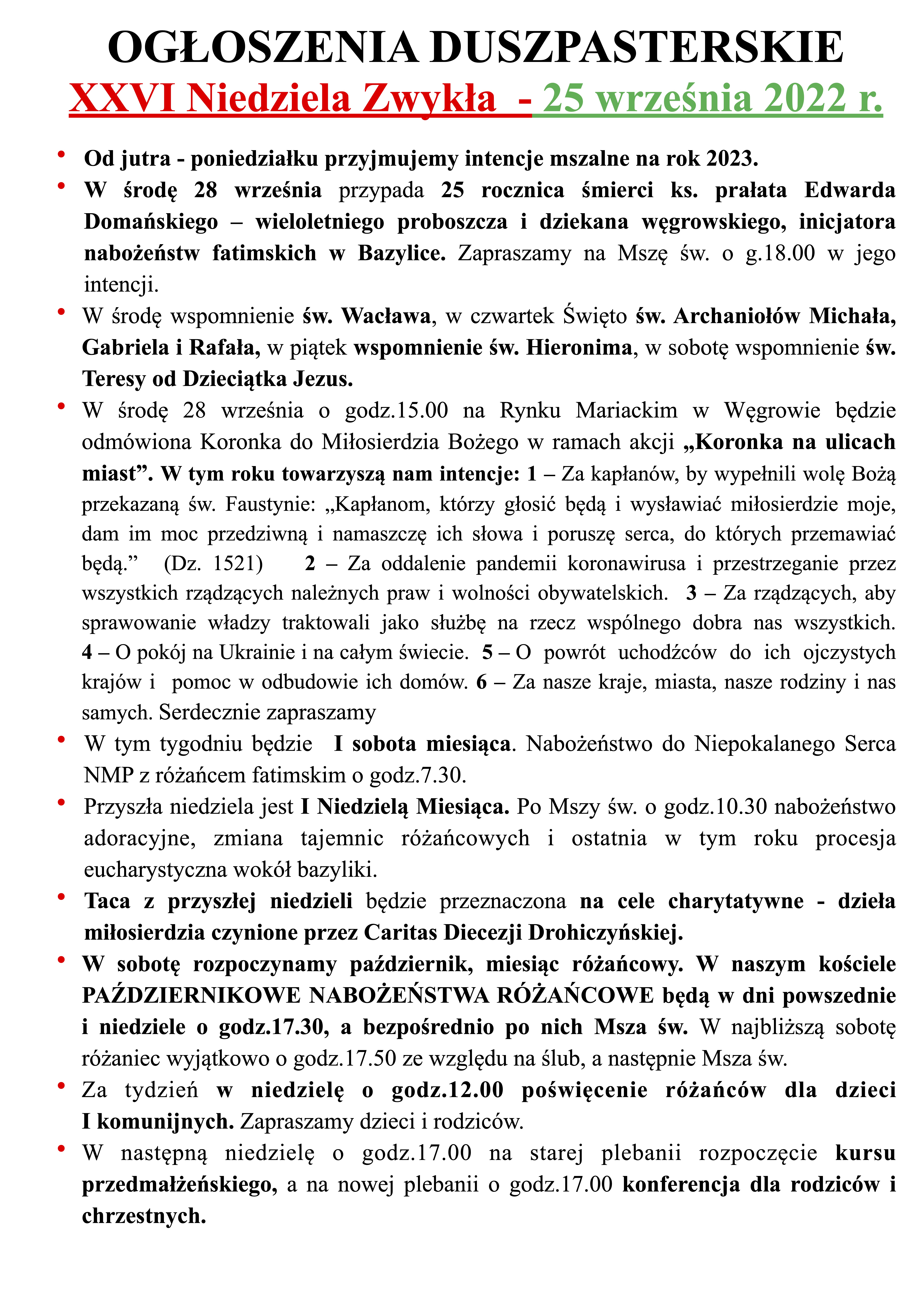 INTENCJE MSZALNE 26.09. – 02.10.22r.