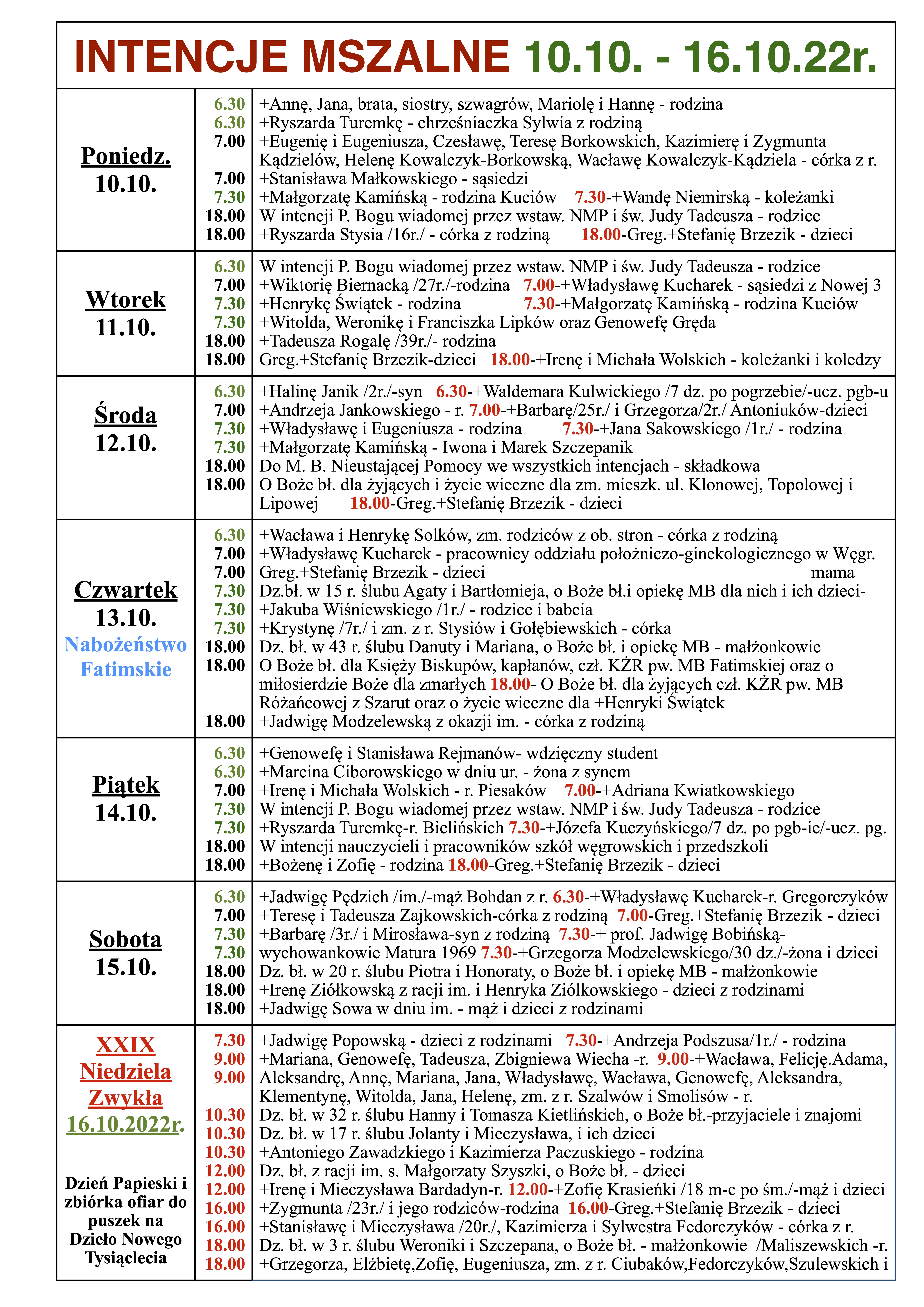 INTENCJE MSZALNE 10.10. – 16.10.22r.