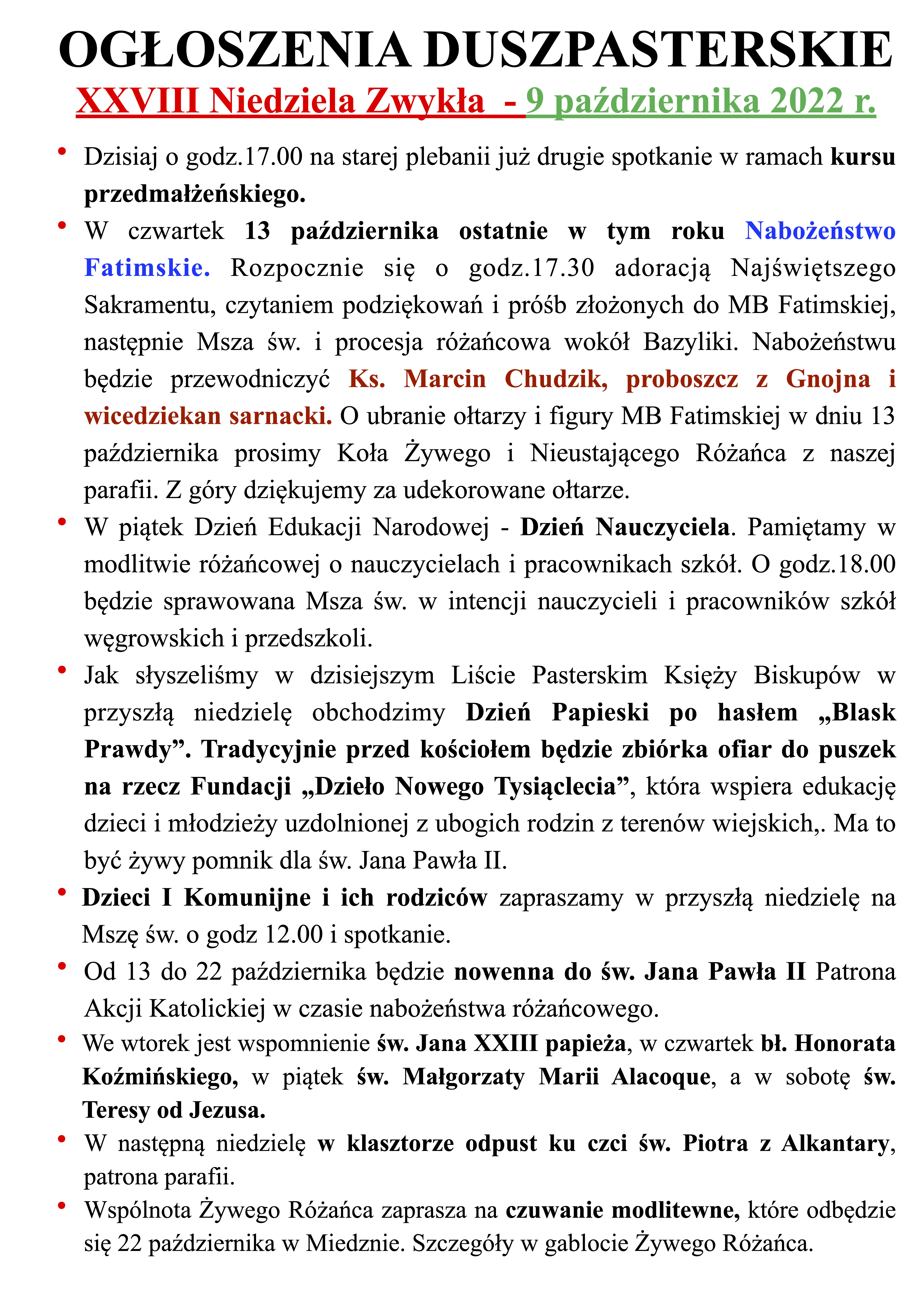 INTENCJE MSZALNE 10.10. – 16.10.22r.
