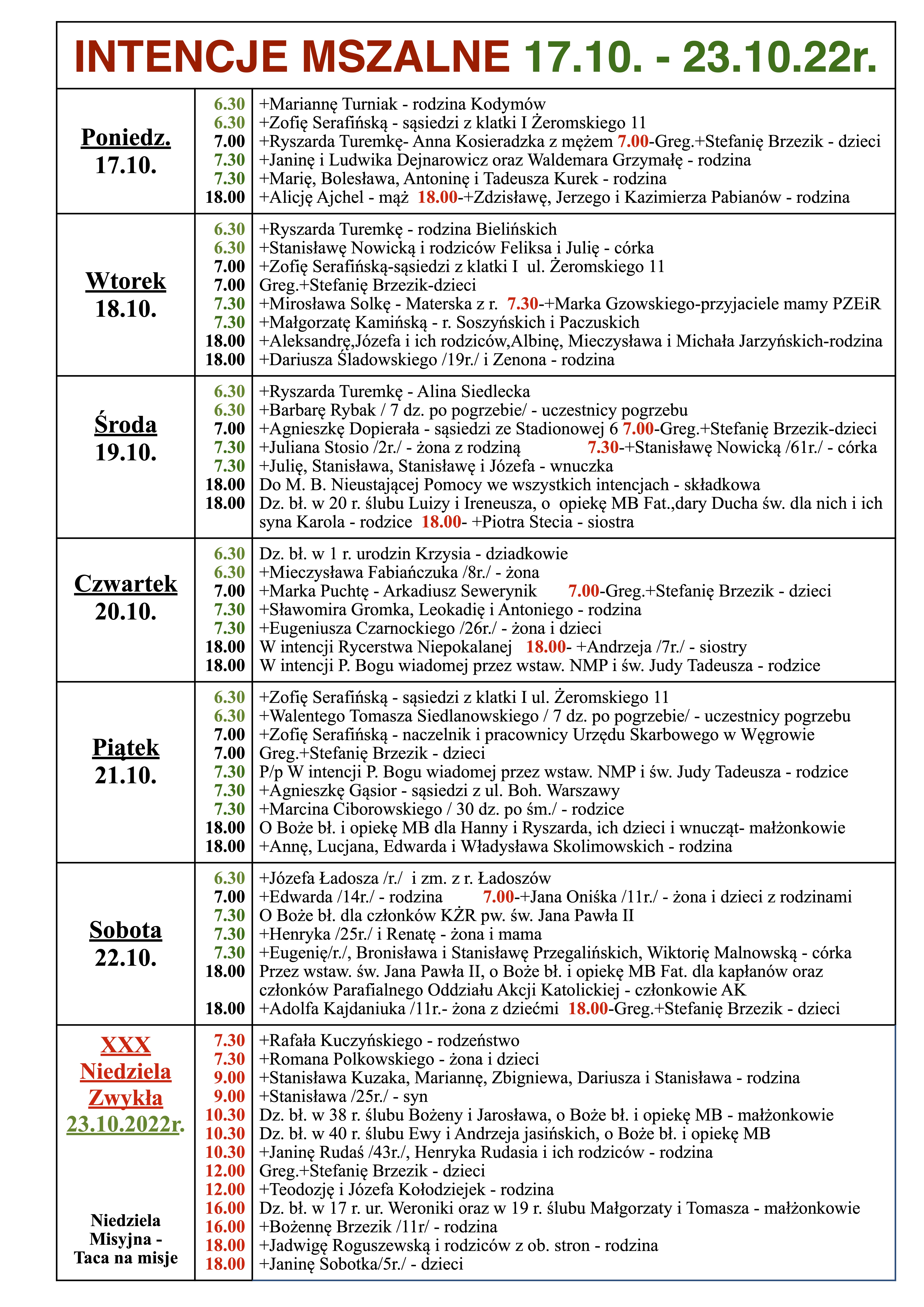 INTENCJE MSZALNE 17.10. – 23.10.22r.