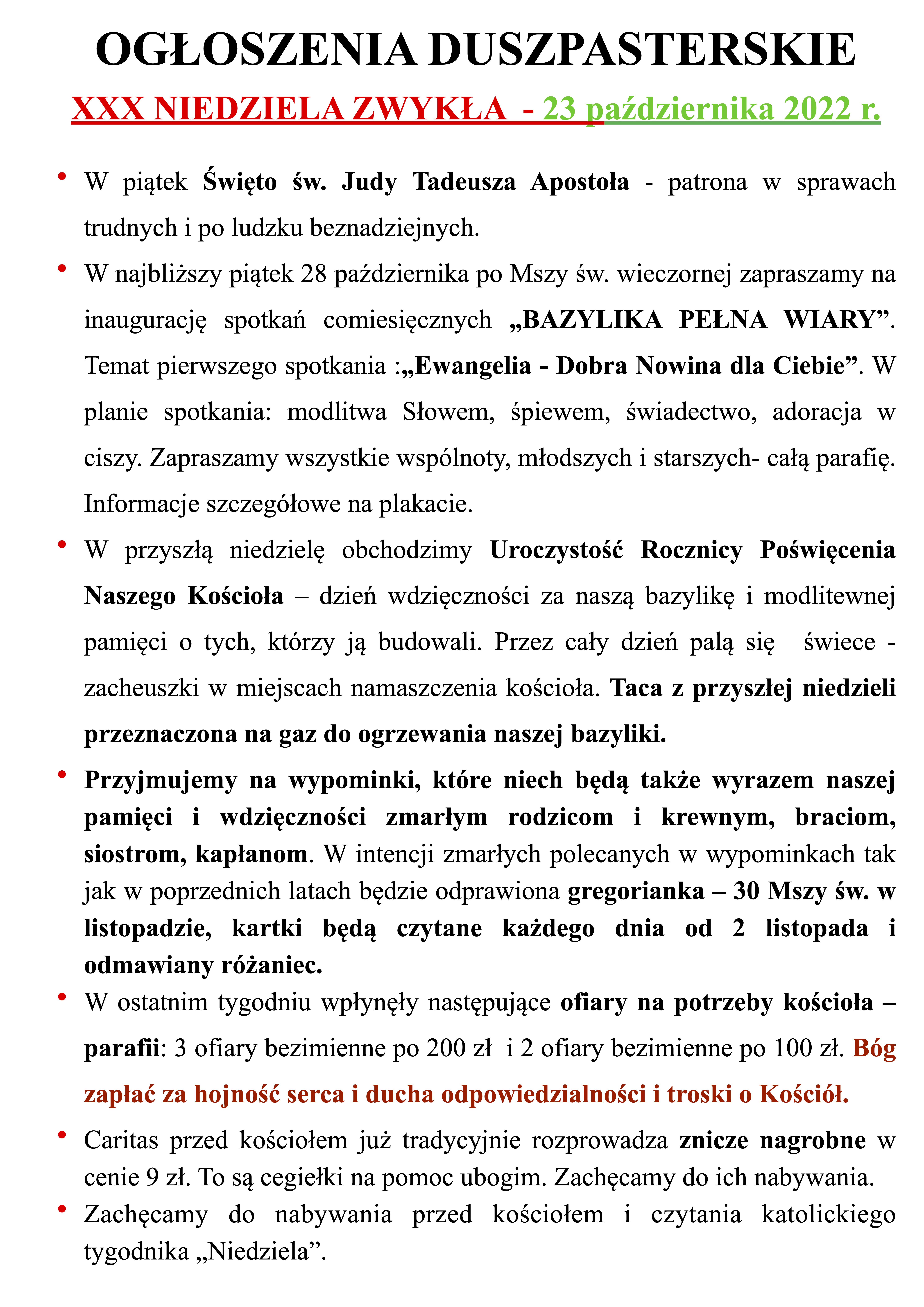 XXX NIEDZIELA ZWYKŁA – 23 października 2022 r.