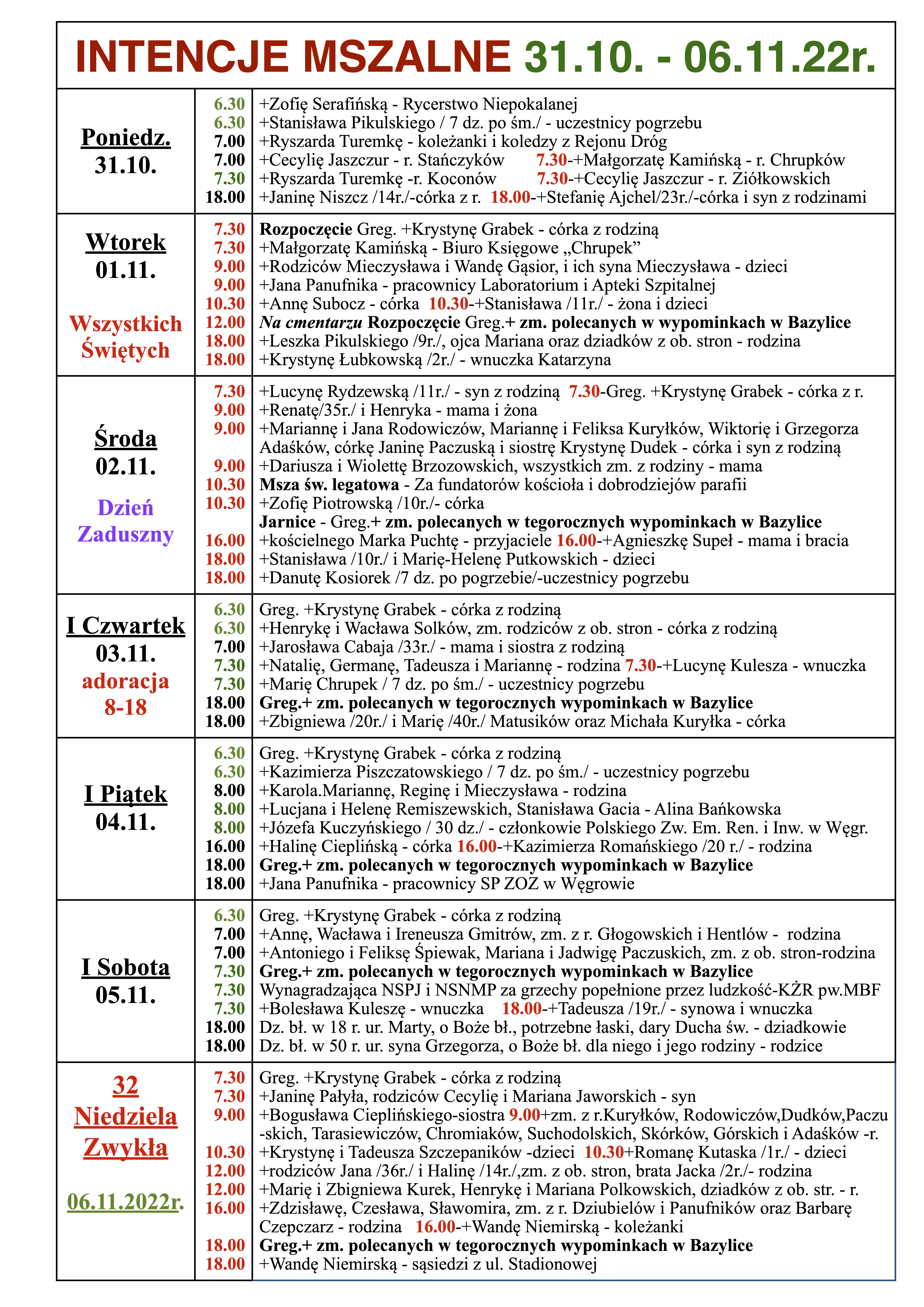 INTENCJE MSZALNE 31.10. – 06.11.22r.