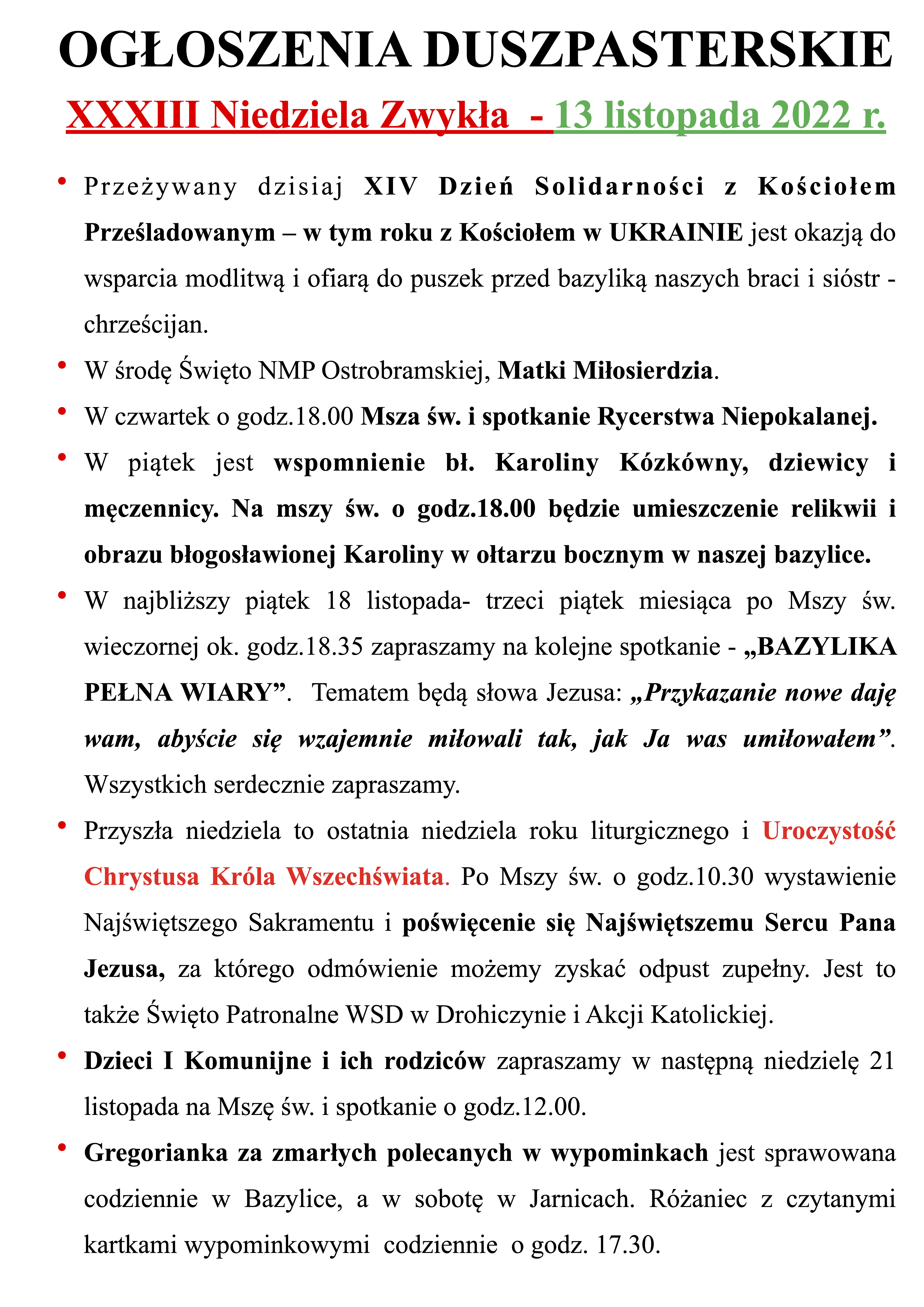 XXXIII Niedziela Zwykła – 13 listopada 2022 r.