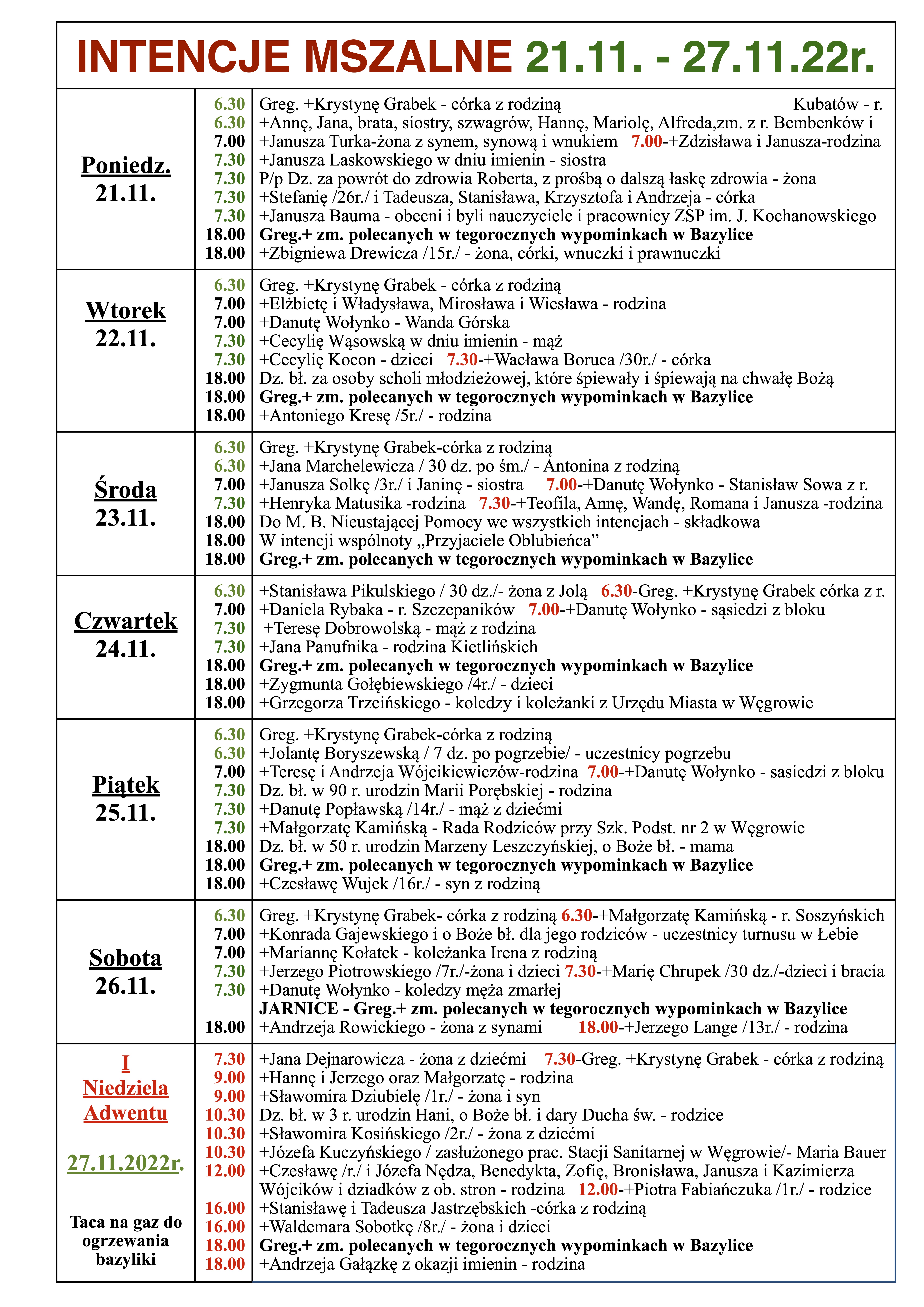 INTENCJE MSZALNE 21.11. – 27.11.22r.