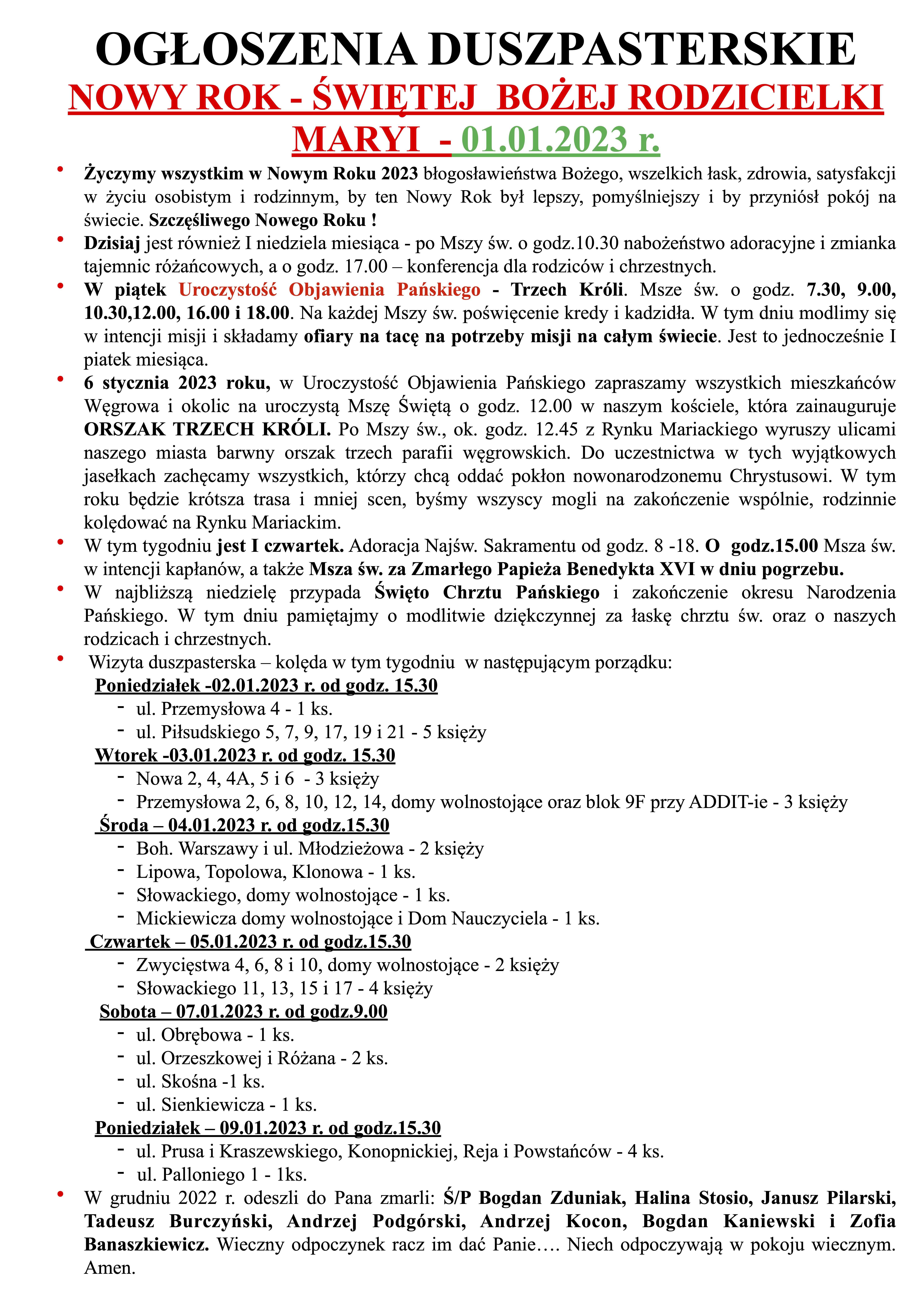 NOWY ROK – ŚWIĘTEJ BOŻEJ RODZICIELKI MARYI – 01.01.2023 r.