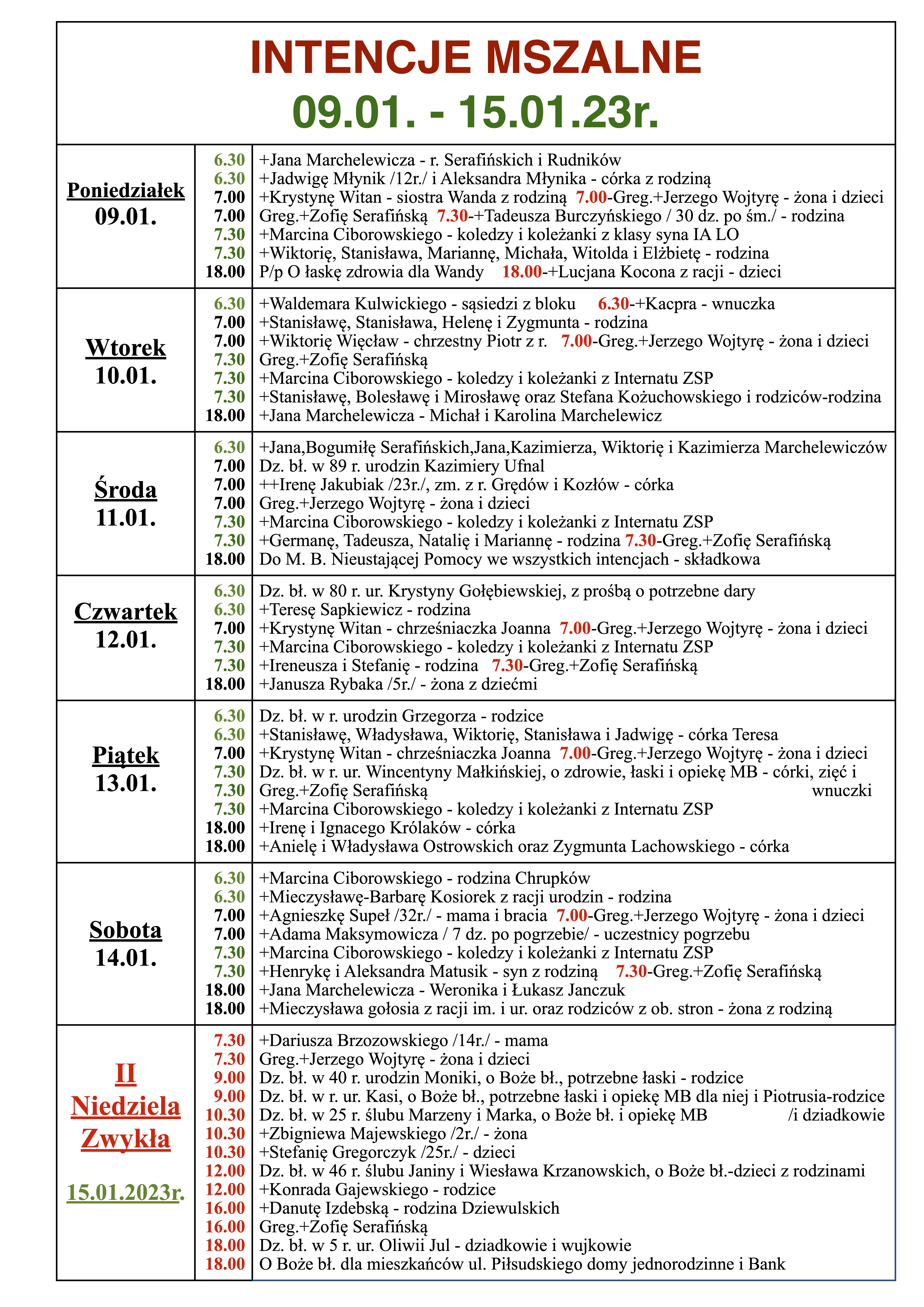 INTENCJE MSZALNE 09.01. – 15.01.23r.