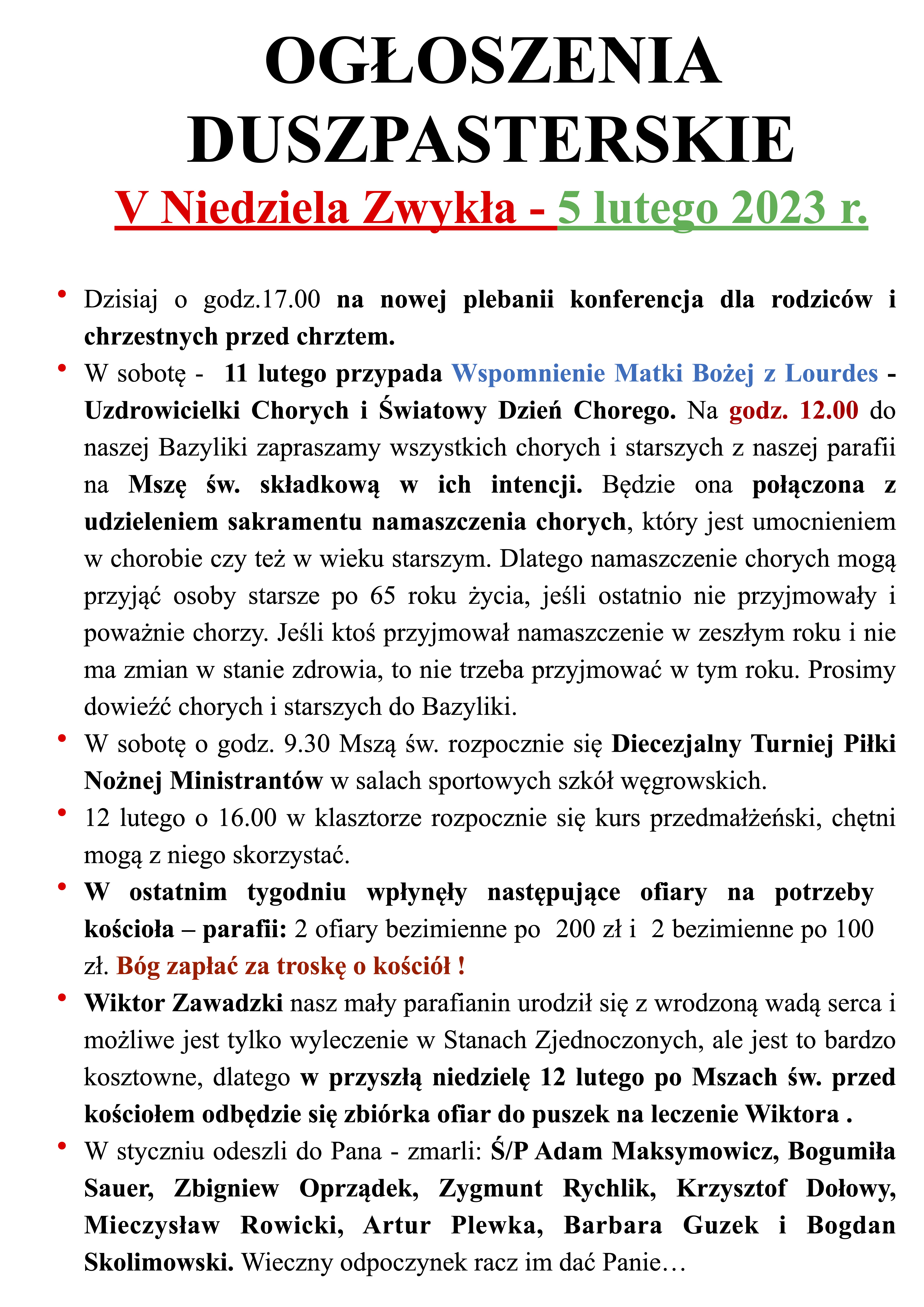 INTENCJE MSZALNE 06.02. – 12.02.2023r.