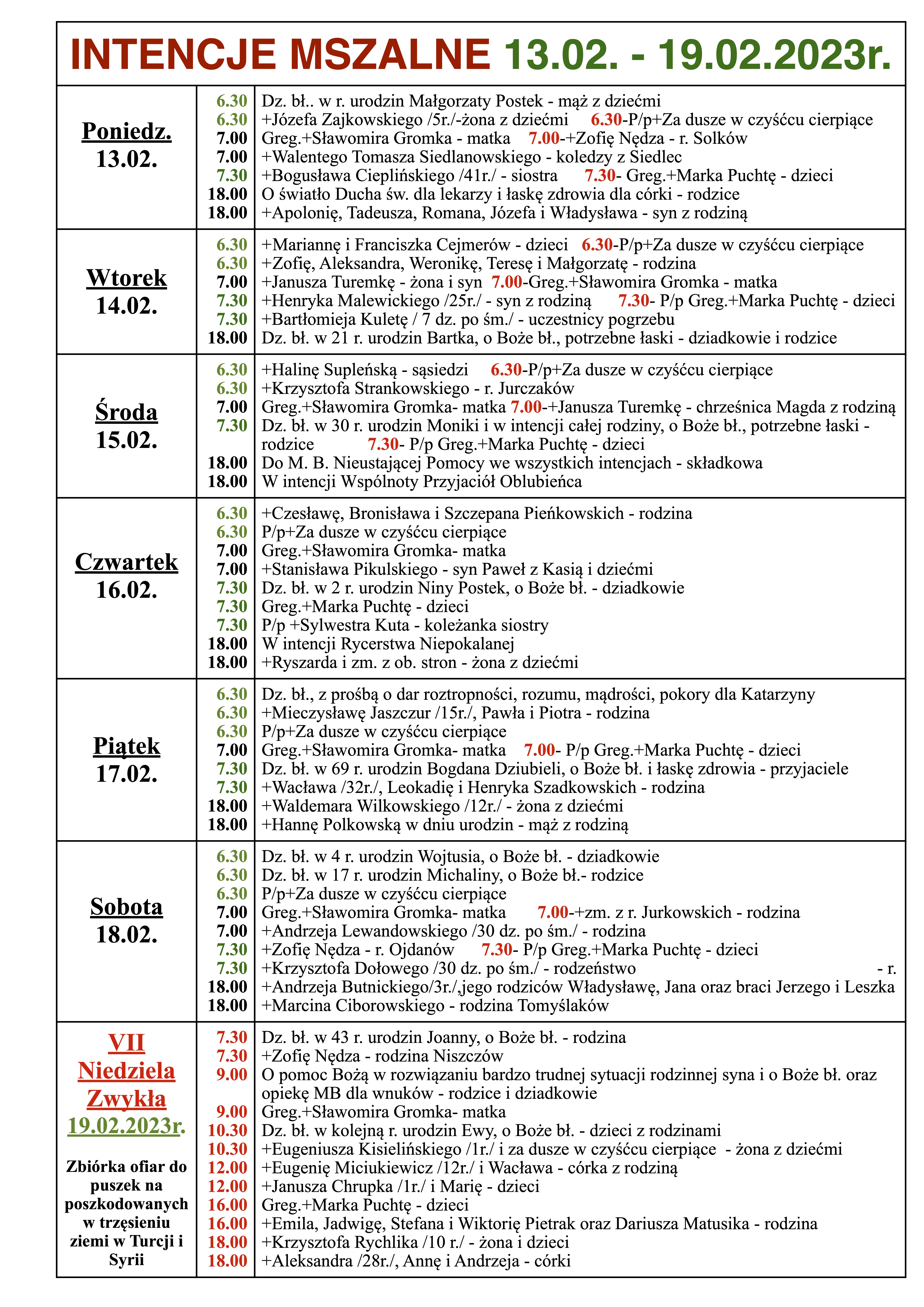 INTENCJE MSZALNE 13.02. – 19.02.2023r.