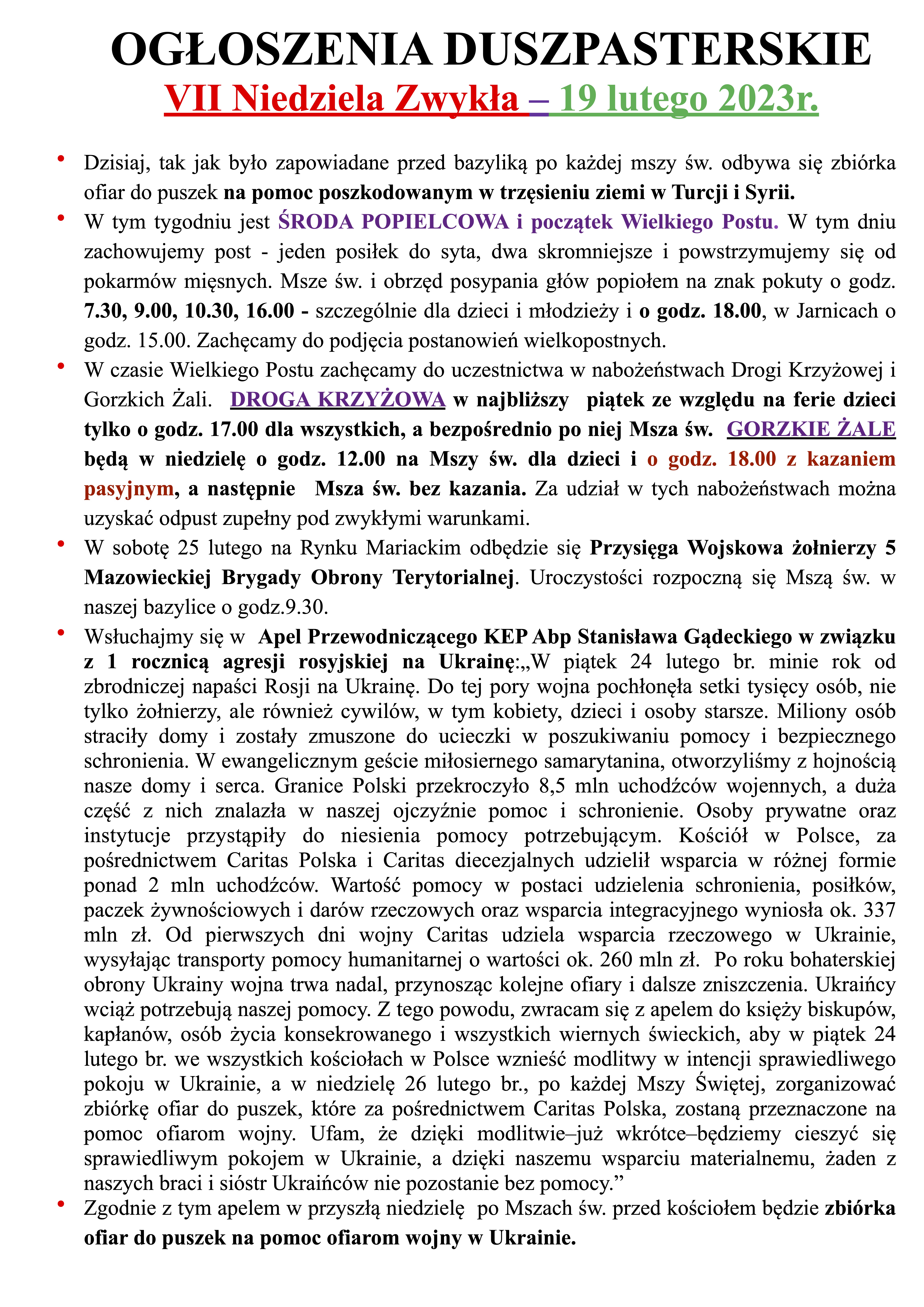 VII Niedziela Zwykła – 19 lutego 2023r.