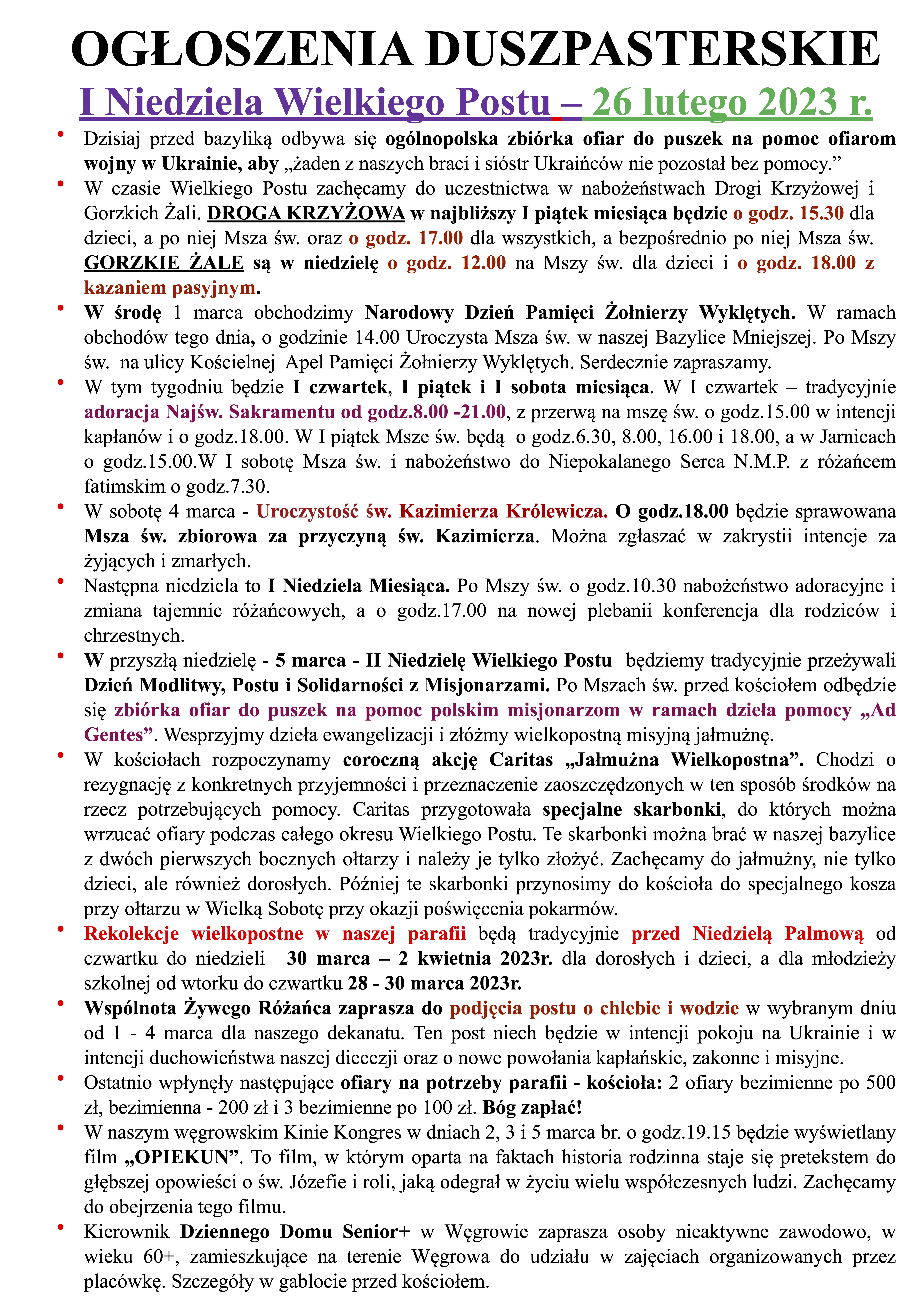 I Niedziela Wielkiego Postu–26 lutego 2023r.