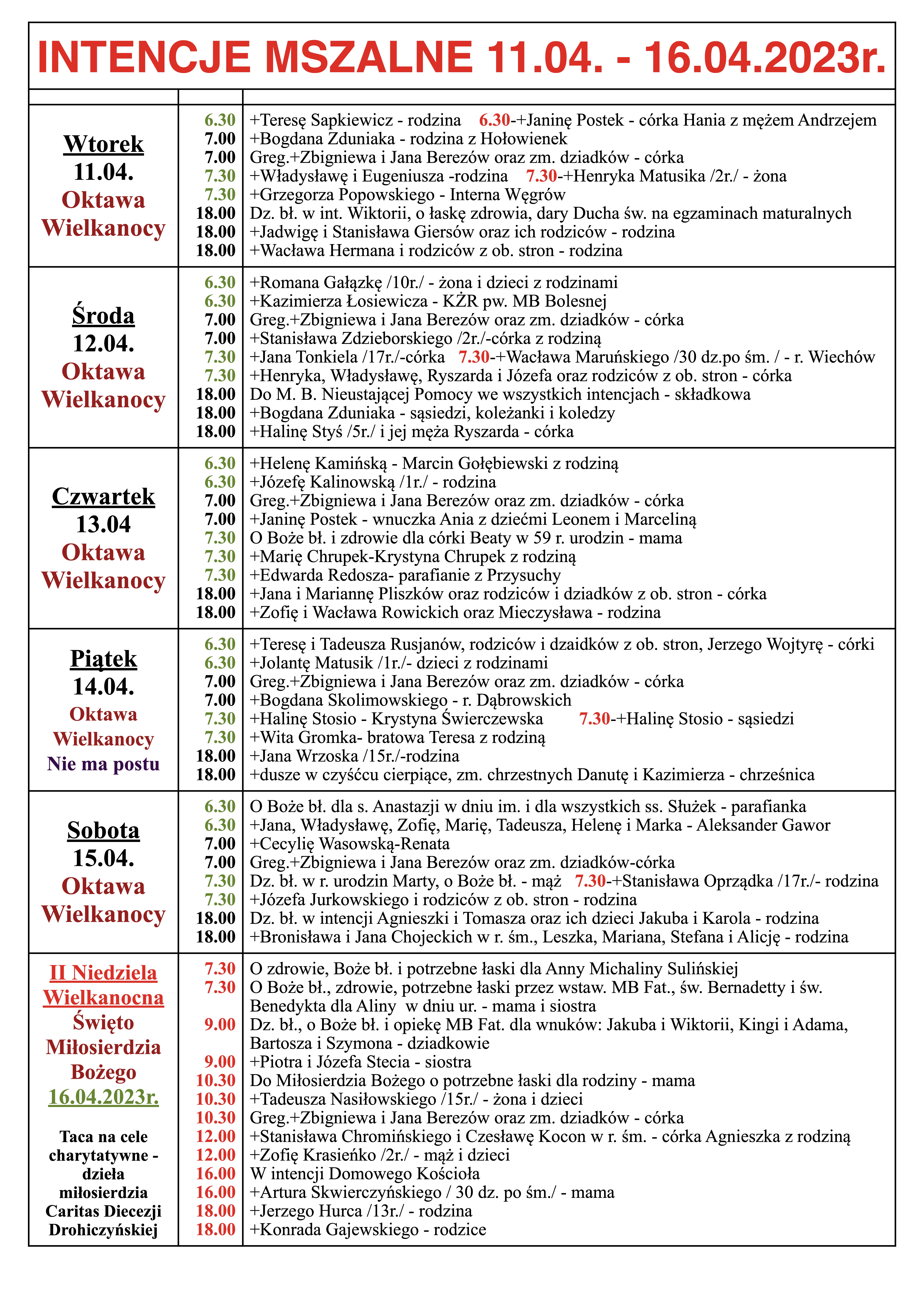 INTENCJE MSZALNE 11.04. – 16.04.2023r.