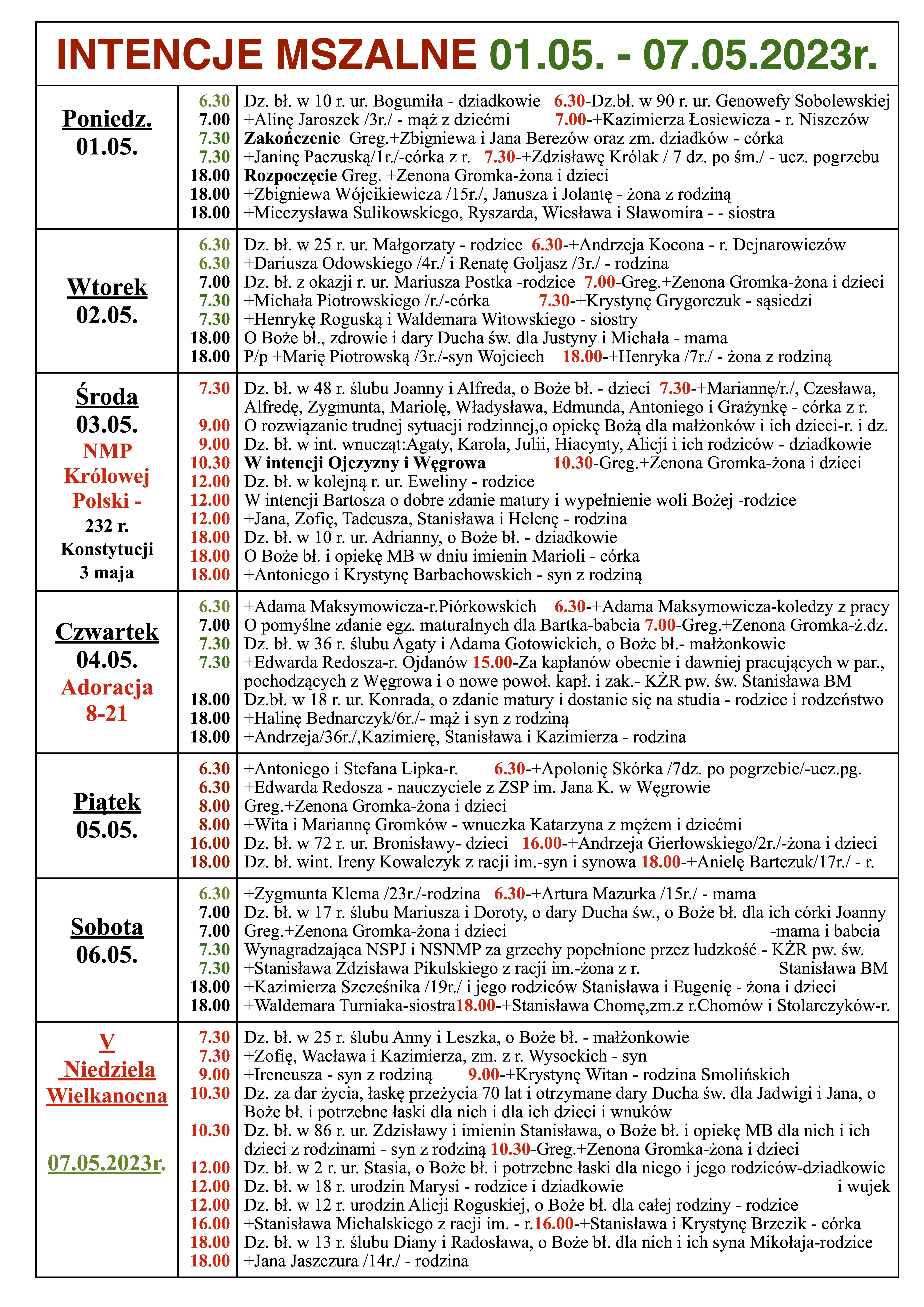 INTENCJE MSZALNE 01.05. – 07.05.2023r.